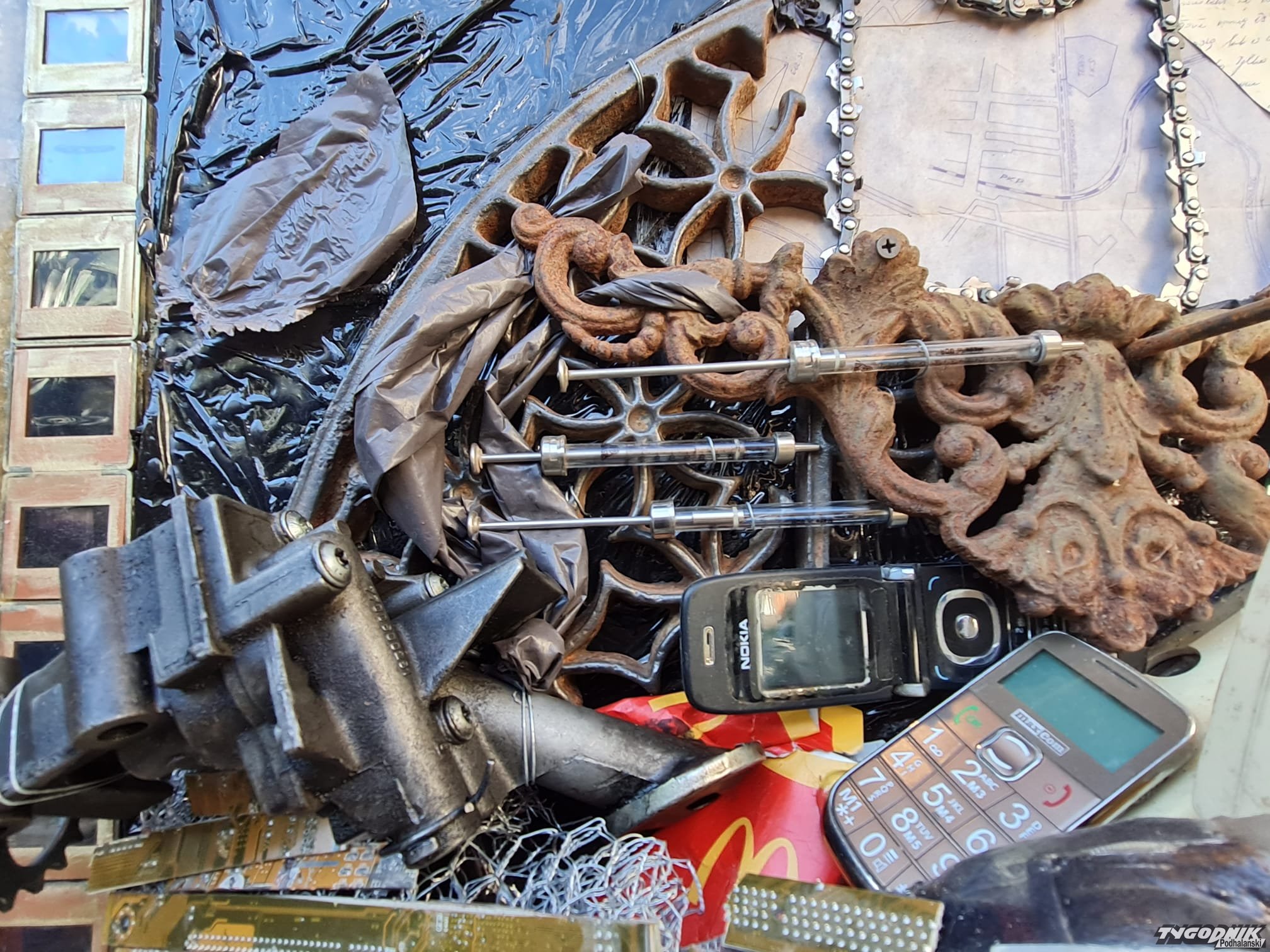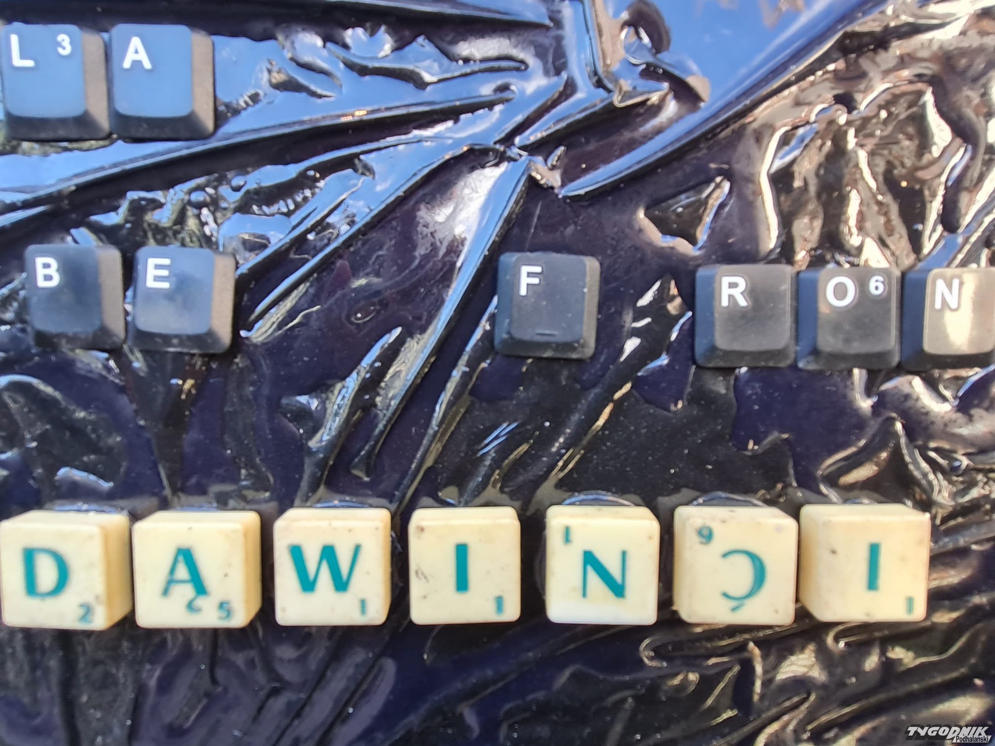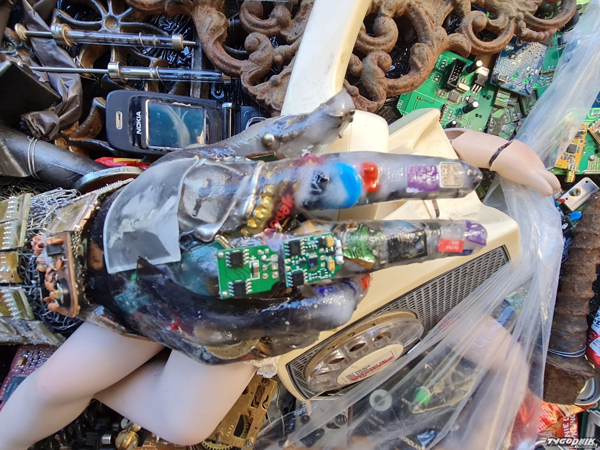 Tworzywem do powstania jego dzieła były m. in. kapsle, puszki, elementy z zepsutych laptopów i odbiorników radiowych, slajdy, sprzączki, stare listy. Szyrszeniowy gronostaj został wykonany ze słuchawki telefonicznej i zepsutej lalki ceramicznej. Łańcuch z piły motorowej pełni funkcję korali. W dłoni widać zalane żywicą guziki, karty SIM.