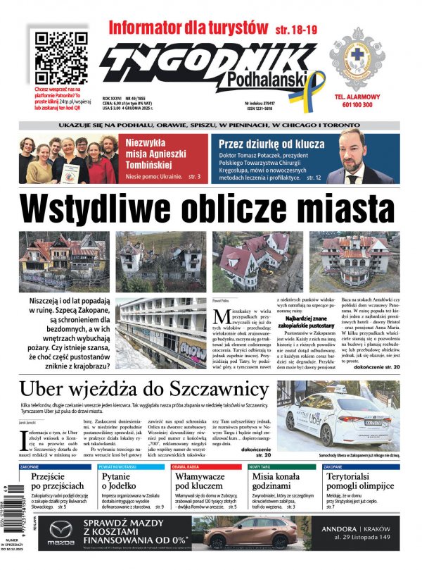2025-12-04 10:02 Planowanie imprezy w domu - porady kulinarne i organizacyjne 2025-12-04 09:59 Nad Tatrami wał z chmur. Mamy niezbyt silny halny (WIDEO) 2025-12-04 09:55 Nowoczesny sposób na zdrowe odżywianie - poznaj jedzenie w płynie od eatyx 2025-12-04 09:30 "Czarne na białym" z Piotrem Wojciechowskim 2025-12-04 09:00 Wstydliwe oblicze miasta 2025-12-04 08:30 Kolumna informacyjna Powiatu Tatrzańskiego 2025-12-04 07:57 Poranny wypadek w Zakopanem 1 2025-12-03 21:00 Jordanów gotowy do świąt 2025-12-03 20:32 Jak dopasować hosting do potrzeb strony www? 2025-12-03 20:00 Dawni i obecni pasterze Tatr. Wyjątkowe wydarzenie w Zakopanem 2 2025-12-03 19:56 Od czego zależy cena ubezpieczenia OC samochodu? Czynniki wpływające na składkę 2025-12-03 19:30 Mikołajkowe sekrety poznacie w MCK 2025-12-03 19:00 Kolejowe przyspieszenie na torach do Zakopanego, w Rabce nowe tory i jeszcze więcej drzew 2025-12-03 18:42 Wynieśli z marketu towar warty ponad 3,5 tysiąca - nie zapłacili 4 2025-12-03 18:30 Historyczne wyróżnienie Tatrzański Mnich dla dr Katarzyny Ceklarz. Pierwsza kobieta w gronie laureatów 2025-12-03 18:00 Ktoś podszywa się pod burmistrza Zakopanego 5 2025-12-03 17:30 Mikołajkowy Turniej Piłkarski 2025-12-03 17:00 Skandaliczny teledysk Karinki Ukrainki, Kuby Bobasa i Pietra Majercyka 12 2025-12-03 16:00 Oszuści znowu aktywni. Zmodyfikowali swoje metody 4 2025-12-03 15:00 Na Krupówkach pojawiła się świąteczna choinka (WIDEO) 1 2025-12-03 14:00 Coraz więcej zgłoszeń o osobach narażonych na wychłodzenie 2025-12-03 13:00 Jan Kubik z prestiżową nagrodą (WIDEO) 2025-12-03 13:00 Zginęły urządzenia badawcze w Tatrach 4 2025-12-03 12:00 Nie daj się oszukać 2025-12-03 12:00 Dolina Strążyska pusta o poranku (WIDEO) 2025-12-03 11:34 Modernizacja parkingu w Krośnicy 1 2025-12-03 11:30 Zakopiańscy policjanci włączają się w operację TOR 1 2025-12-03 11:00 Mamy pozwolenie na wycinkę 3 2025-12-03 10:30 Pierwsza Nagroda "Pamięć i Tożsamość" w Bukowinie 2025-12-03 09:00 Przysłop Miętusi: Idealne miejsce na krótką wycieczkę (WIDEO) 2025-12-03 09:00 Młodzi śpiewali patriotyczne piosenki 2025-12-03 07:59 Dziadońcyne Granie po raz 19. w Bukowinie Tatrzańskiej. Triumf muzyki z Krakowa 2 2025-12-02 21:00 40-lecie Parafii Miłosierdzia Bożego na Chramcówkach 4 2025-12-02 20:00 Skok liczby interwencji z 562 do 868. Policja omawia problem spożywania alkoholu w Zakopanem 9 2025-12-02 19:28 Gmina Poronin świętuje 30-lecie. Uroczysta sesja, medale i wyróżnienia 1 2025-12-02 19:00 Kolejny dzień z inwersją i słońcem w Tatrach (WIDEO) 2025-12-02 18:30 35 lat partnerstwa Zakopanego i Saint-Dié. Historia, która zaczęła się w 1990 roku 2 2025-12-02 18:00 Budowa TBS na Kamieńcu z opóźnieniami. Kiedy będzie gotowa? 5 2025-12-02 16:59 Od dziś nowe zasady parkowania w Zakopanem. Dobre zmiany? 7 2025-12-02 16:30 Prezydent Karol Nawrocki zawetował ustawę łańcuchową 43 2025-12-02 16:00 Wieczór z Henrykiem Mikołajem Góreckim i Joanną Wnuk-Nazarową 2025-12-02 15:00 Zimowe zamknięcie popularnych szlaków w Tatrach (WIDEO) 2025-12-02 14:01 Zakopiańscy policjanci jednego dnia zatrzymali trzech pijanych kierowców 1 2025-12-02 13:30 Spotkanie ze Św. Mikołajem 16 2025-12-02 13:06 Krupówki rozświetlone słońcem (WIDEO) 2025-12-02 12:50 Tragedia w Nowym Targu 2025-12-02 12:00 Zwyrodnialec, który z szczególnym okrucieństwem zabił psa - trafi do więzienia 10 2025-12-02 11:15 W środę przerwy w dostawie wody w Zakopanem 2025-12-02 11:01 Zamiast kupować rasowego szczeniaka warto odwiedzić schronisko dla zwierząt w Nowym Targu 2 2025-12-02 11:00 Zofia Szwajnos z wystawą w Budapeszcie