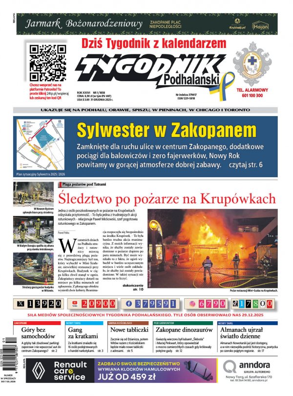 2025-12-31 10:43 Słuczka dwóch osobówek na Spiszu 2025-12-31 10:39 Nocna akcja TOPR. Ratownicy proszą o rezygnację z górskich wycieczek (WIDEO) 2025-12-31 10:38 Na Równi Krupowej wyrastają stragany 2025-12-31 10:31 Przed sylwestrem w Zakopanem. Zamknięte parkingi i ulice 2025-12-31 10:26 Prawdziwa śnieżyca w Zakopanem (ZDJĘCIA) 2025-12-31 10:07 Kombatant - kto to? 2025-12-31 10:00 Mężczyzna z licznymi urazami w Szczawnicy 2025-12-31 09:00 Zderzenie trzech aut w Jabłonce 2025-12-31 08:22 Pomóżcie odnaleźć Reksia 2025-12-31 08:12 Pożar wiaty garażowej w Lipnicy Małej 2025-12-31 08:00 Dziś papierowe wydanie Tygodnika, a w nim kalendarz na 2026 rok! 2025-12-30 21:30 Otwarte drzwi, to okazja dla złodzieja 1 2025-12-30 20:30 Ty podziwiasz fajerwerki, a zwierzęta cierpią 10 2025-12-30 19:30 Krakowiacy i Górale w zubrzyckim skansenie 2025-12-30 18:49 Pożar budynku na Olczy Stachonie w Zakopanem (WIDEO) 2025-12-30 18:24 Odnowiony budynek OSP w Grywałdzie 2025-12-30 18:00 Kameralne spotkanie z muzyką 2025-12-30 17:46 Sylwester oznacza znacznie krótszy czas pracy dla urzędu 6 2025-12-30 17:30 Kobieta, która uczyniła z ubioru język sztuki i siły. Mamy dla Was książkę 2025-12-30 17:00 Niebywałe, budżet Nowego Targu uchwalony jednogłośnie 2 2025-12-30 16:30 Starostwo Powiatowe w Zakopanem pracuje krócej w Sylwestra 3 2025-12-30 16:00 Sylwester w Zakopanem z Radiem Złote Przeboje, wszystko co trzeba wiedzieć, by dobrze się bawić 5 2025-12-30 15:30 Dobre wieści z Grywałdu. Nasz film naprawdę zadziałał. 6 2025-12-30 15:00 Paraliż ruchu kolejowego na trasie Kraków Lotnisko - Wieliczka Rynek-Kopalnia 1 2025-12-30 14:01 Gwałciciel już ogląda świat zza kratek 1 2025-12-30 13:33 W Krościenku trwa Jarmark Świąteczny (WIDEO) 2025-12-30 13:00 Ta gmina to jakiś ewenement 4 2025-12-30 12:01 Trwa budowa sceny sylwestrowej (WIDEO) 2 2025-12-30 11:30 Wielki Sylwester w Szczawnicy 2025-12-30 11:00 Mróz, śnieg i wiatr. Zimowa pogoda w Zakopanem. Ostrzeżenie przed zamiecią 2025-12-30 10:00 Pienińskie kolędowanie 1 2025-12-30 09:00 W Tatrach drugi stopień zagrożenia lawinowego 2025-12-30 08:02 Dofinansowanie od wojewody pozwoli uruchomić cztery nowe linie komunikacyjne 1 2025-12-29 22:59 Zakopane - sprzedam tanio różne BIURKA 2025-12-29 21:20 Sylwester jak zdarzenie masowe. Ratownicy szykują się na trudną noc (WIDEO) 7 2025-12-29 21:00 Gramy dla Pawła - Maniowy zjednoczone w charytatywnym turnieju 2025-12-29 20:00 Zakaz fajerwerków w Zakopanem obowiązuje przez cały rok. Policja apeluje o rozsądek 16 2025-12-29 19:00 Damy z siebie wszystko - zapewniają nasi mistrzowie w snowboardzie (WIDEO, ZDJĘCIA) 2025-12-29 18:31 Tomasiak i Stoch w drugiej dziesiątce. Zwycięża Prevc 2025-12-29 18:30 Blisko pół miliona złotych od Województwa Małopolskiego na Puchar Świata w skokach 7 2025-12-29 18:24 Karambol czterech aut w Szaflarach 2025-12-29 17:44 Ośmiolatek odnaleziony dzięki szybkiej akcji strażników 1 2025-12-29 17:33 Romskie kapele wróciły na Krupówki (WIDEO) 17 2025-12-29 17:30 Dobra zabawa bez petard. TPN po raz kolejny apeluje: Nie strzelaj w sylwestra 2025-12-29 16:59 Pożar w Rabce 2025-12-29 16:35 To już jutro Jarmark Świąteczny w Krościenku (WIDEO) 1 2025-12-29 16:00 Na osiedlu Niwa powstaje Niwiańska Przystań 2025-12-29 15:33 Zakopane - sprzedam MEBLOŚCIANKĘ 2025-12-29 15:00 Dziś słońce, ale sylwester ze śniegiem i solidnym mrozem 2025-12-29 14:24 Kolejny dzień z korkami 1