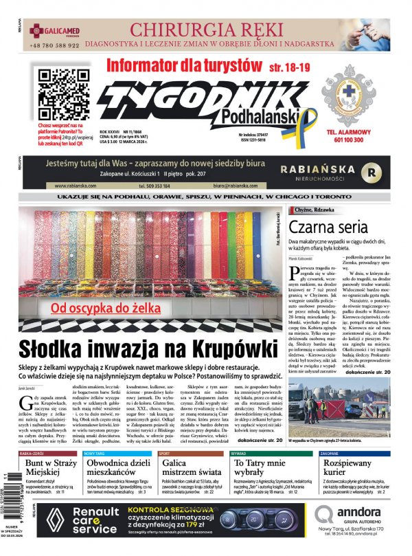 2026-03-12 11:19 Psychologia powrotu do partnera i odbudowa relacji 2026-03-12 10:59 Olga Łyjak i Marcin Piętka zwycięzcami 38. Memoriału Jana Strzeleckiego w narciarstwie wysokogórskim 2026-03-12 09:59 Krokusy i cudowny poranek w Zakopanem (WIDEO) 2026-03-12 09:00 Wojewoda bada likwidację szkoły w Rzepiskach. Są wątpliwości co do procedury 2026-03-12 08:00 Słodka inwazja na Krupówki 4 2026-03-11 21:35 Dyplomowy hołd muzyczny dla bohaterów Armii Krajowej i Polskiego Państwa Podziemnego 2026-03-11 21:00 Nie dla planu miejscowego 1 2026-03-11 20:30 Podstawówka z Poronina zdobyła Puchar Wójta. Wiemy kto jeszcze stanął na pudle 2026-03-11 20:03 Nikt nie chce kupić niedokończonej galerii Color Park w Nowym Targu 1 2026-03-11 19:00 Nielegalny tytoń i papierosy zabezpieczone przez policję 2 2026-03-11 18:00 Hotelarze z Ponic w telewizyjnym programie walczą o klientów 3 2026-03-11 17:21 Nowy sprzęt dla służb w Zakopanem. Miliony złotych na bezpieczeństwo mieszkańców (WIDEO) 9 2026-03-11 17:00 Nie żyje długoletnia dyrektorka orawskiego skansenu w Zubrzycy Górnej 2026-03-11 16:30 Historia życia jednego z najlepszych fałszerzy dzieł sztuki, ale nie tylko. Mamy dla Was książki 2026-03-11 16:25 Bartłomiej Jurecki nagrodzony za super zdjęcie. Portalem roku został jawnylublin.pl 1 2026-03-11 16:00 Rynek w Nowym Targu do naprawy 2 2026-03-11 15:32 FiśBanda zachwyciła w Must Be The Music. Teraz walczy o półfinał 2026-03-11 15:30 Obóz żeglarski - przygoda pod żaglami z Kompasem 2026-03-11 15:25 Krupówki wyczyszczone z pozostałości po zimie i turystów (WIDEO) 5 2026-03-11 15:00 Dzień Sołtysa w gminie Poronin. Podziękowania za pracę na rzecz mieszkańców 1 2026-03-11 14:25 Tragedia w centrum Zakopanego. W pożarze zmarła kobieta 2026-03-11 14:25 Pod Babią Górę zjadą Orawianie z całego świata 2026-03-11 14:11 Rozpoczęła się Gala SGL Local Press 2025, wśród nominowanych trójka naszych dziennikarzy (WIDEO) 3 2026-03-11 14:00 Orawa na medal 2026-03-11 13:30 W niedzielę kolejne spotkanie z poezją 2026-03-11 13:25 Posłanki KO pytają o stanowiska dla działaczy PiS w Małopolsce. Blisko 70 osób w spółkach i instytucjach 18 2026-03-11 13:00 W Tatrach dość silny wiatr. Tak rano było w Kondratowej (WIDEO) 1 2026-03-11 12:30 Bardzo śliskie szlaki w Tatrach. Miejscami lodowisko! 2026-03-11 11:47 Grzegorz Niezgoda, były burmistrz Szczawnicy rezygnuje z funkcji zastępcy wójta gminy Chełmiec 2 2026-03-11 11:39 Przerwa w dostawie wody w Kościelisku. Utrudnienia na dwóch ulicach 2026-03-11 11:30 Koncert: Klenczon - legenda 5 2026-03-11 11:00 Pijany kierowca zatrzymany w Zakopanem. Policja zarekwirowała samochód 3 2026-03-11 10:24 "Piękno Małopolski - słowem opisane". Zgłoszenia do konkursu 2026-03-11 10:00 Spóźnił się na pociąg i został na mrozie. Policjanci pomogli inwalidzie na wózku 2026-03-11 09:22 Wielki pożar na Orawie 2 2026-03-11 09:00 Zniknęły szczenięta z lasu w Bańskiej Niżnej. Fundacja z Podhala prosi o pomoc 9 2026-03-11 07:59 Słonecznie w Zakopanem, cieplej w dolinach. Uwaga na silny wiatr w Tatrach 2026-03-10 21:25 Łanie przy stacji paliw w Zakopanem. Spokojnie... my dalej jeździmy na trawie 13 2026-03-10 20:30 Karatecy z całej Polski spotkają się w Zakopanem. III Memoriał Shihan Włodzimierza Weselskiego 2026-03-10 19:30 Pół roku od otwarcia stadionu miejskiego przy ul. Orkana 12 2026-03-10 19:00 Łyżnik - niezwykła półeczka na łyżeczki. Spotkanie w Kolibie 1 2026-03-10 18:30 Kierowca fiata potrącił mężczyznę w centrum Zakopanego 2 2026-03-10 17:28 Pożar na Olczy. Strażacy przypominają 2026-03-10 17:00 Kolejne sukcesy młodzieży z powiatu nowotarskiego 2026-03-10 16:30 Czy wiesz, jak długo żyje jaskółka? 1 2026-03-10 15:30 Trzej dziennikarze "Tygodnika Podhalańskiego" z nominacjami w ogólnopolskim konkursie SGL 2026-03-10 14:30 Tragiczny finał poszukiwań 2026-03-10 14:25 Poszukiwany listem gończym 1 2026-03-10 13:30 Ku przestrodze. Mogło zakończyć się tragedią (WIDEO) 5 2026-03-10 12:30 Kradł sprzęt narciarski i wpadł w ręce policyjnego patrolu na Kasprowym Wierchu 10