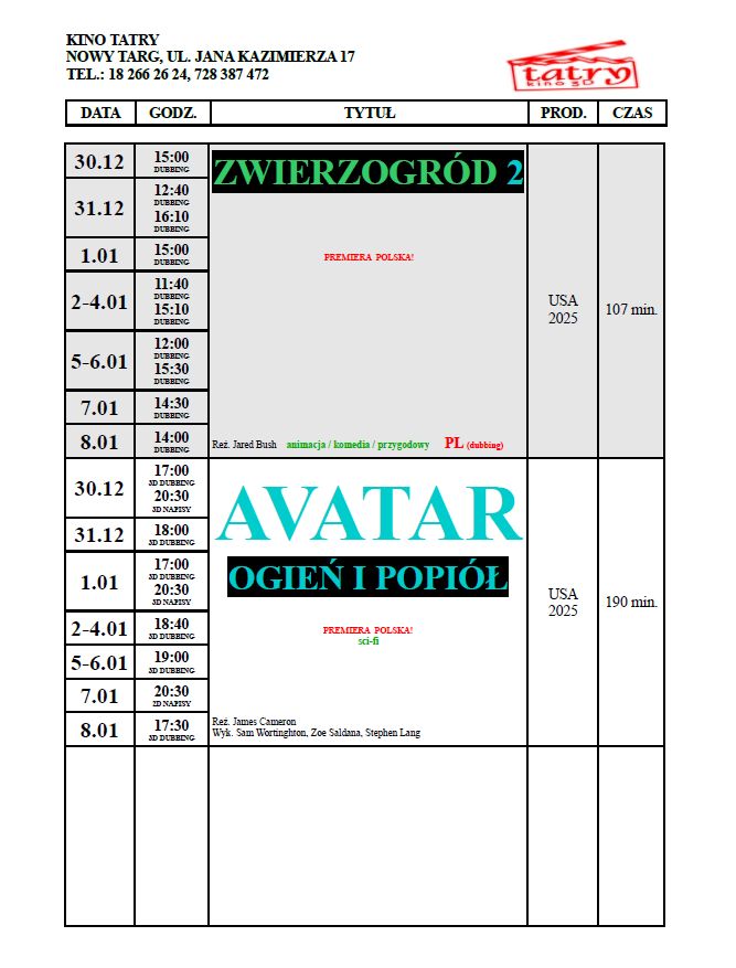 2026-01-01 21:00 Budżet (nie)inwestycyjny, wójt o najważniejszych zadaniach, opozycja chce więcej (WIDEO) 2026-01-01 20:00 Najpiękniejsze pienińskie i polskie kolędy (WIDEO) 2026-01-01 19:00 Święta noc. Koncert bożonarodzeniowy 2026-01-01 18:00 Oczyszczalnia ścieków w Spytkowicach gruntownie zmodernizowana 2026-01-01 17:04 Sylwester w Zakopanem (ZDJĘCIA) 1 2026-01-01 16:53 Kacper Tomasiak najlepszym z Polaków w Garmisch-Partenkirchen 1 2026-01-01 16:30 Coś do poczytania w zimowe wieczory. Mamy dla Was książki 2026-01-01 16:24 Czy te skutery mogą wjeżdżać na polany na Bachledzkim Wierchu? 12 2026-01-01 16:12 Apel o pomoc w odnalezieniu zguby 2026-01-01 16:00 Święto Trzech Króli pod Giewontem 2026-01-01 15:42 Zakopianka prawie pusta. Nie ma korków 2026-01-01 14:58 Sylwester marzeń czy sylwester regionalny? 10 2026-01-01 14:26 Sylwestrowy pożar w Lipnicy Małej 2026-01-01 13:59 Tajemnicza Aurora B. Świetny koncert Tatrzańskiej Orkiestry Klimatycznej (ZDJĘCIA, WIDEO) 2026-01-01 13:28 Plecak zagubiony na Gubałówce 2026-01-01 13:00 Kolędowy wieczór w Czerwonym Dworze 2026-01-01 12:29 Sylwestrowe wyjazdy szczawnickich druhów 2026-01-01 12:00 Pendolino za 450 zł! A może lepiej przylecieć samolotem? 1 2026-01-01 11:00 Koncert Noworoczny w Miejskim Centrum Kultury 2026-01-01 10:48 Polka utknęła na Babiej Górze w sylwestrową noc 6 2026-01-01 09:58 Równia Krupowa wysprzątana po sylwestrowym koncercie (WIDEO) 9 2026-01-01 08:46 Spokojny sylwester. 10 tys. osób na Równi Krupowej. Pojedyncze bójki i awantury 4 2026-01-01 01:02 W Krośnicy znaleziono młodego pieska 2026-01-01 00:41 Petardy nad centrum Zakopanego. Tak mieszkańcy powitali Nowy Rok 17 2026-01-01 00:23 Tak Zakopane przywitało 1 stycznia. Szczęśliwego Nowego Roku (WIDEO) 6 2025-12-31 23:33 Pół godziny przed północą. Na Krupówkach tłumów brak 3 2025-12-31 23:27 Piesek znaleziony w Zakopanem 2025-12-31 22:52 De Mono na sylwestrowej scenie w Zakopanem (WIDEO) 3 2025-12-31 21:52 Na razie bardzo spokojny sylwester 5 2025-12-31 21:20 Zmarła Janina Rzadkosz-Sichelska 2025-12-31 20:20 Na Krupówkach sprzedają fajerwerki 9 2025-12-31 20:00 Państwowe Polskie Koleje Linowe 2 2025-12-31 19:14 Rozpoczął się koncert sylwestrowy na Równi Krupowej (WIDEO) 6 2025-12-31 18:37 Wieczór sylwestrowy z Aurorą B 2025-12-31 17:49 Duży pożar w Sieniawie (ZDJĘCIA, WIDEO) 2025-12-31 17:41 Na Olczy Stachoniach utknęła cysterna (WIDEO) 2 2025-12-31 17:30 Nie żyje Władysław Łukaszczyk Mulorz, twórca ludowy 2025-12-31 17:30 Magdalena Berbeka, Michał Zaborowski i Andrzej Świetlik w Witkacym 2025-12-31 16:59 Zimowy paraliż pod Tatrami. Policja apeluje: w góry tylko na oponach zimowych 2 2025-12-31 16:51 Awaria w dostawach prądu na Podhalu 5 2025-12-31 16:45 Sylwestrowe życzenia z Krupówek trafią na łamy Tygodnika Podhalańskiego 2025-12-31 16:15 Witryny sklepów na Krupówkach zabezpieczone przed sylwestrowymi gośćmi 8 2025-12-31 16:00 Szklany kac pod Tatrami. Sylwestrowi balowicze już zostawiają śmieciowe ślady 3 2025-12-31 15:56 Gdy trudne warunki, załóż łańcuch na koła, brak łańcucha oznacza mandat 1 2025-12-31 15:00 Apel wójt Poronina: nie strzelaj w sylwestra. To strach i cierpienie zwierząt 6 2025-12-31 14:00 Budżet powiatu nowotarskiego na przyszły rok uchwalony 2025-12-31 13:35 Dobre warunki na stokach w Bukowinie Tatrzańskiej (wideo) 2025-12-31 13:30 Kasia zaprasza na kulig do Murzasichla (WIDEO) 3 2025-12-31 13:00 Burmistrz Zakopanego zaprasza na sylwestra i apeluje (WIDEO) 13 2025-12-31 12:00 Zmiany numerów linii komunikacji miejskiej w Zakopanem od 2026 roku