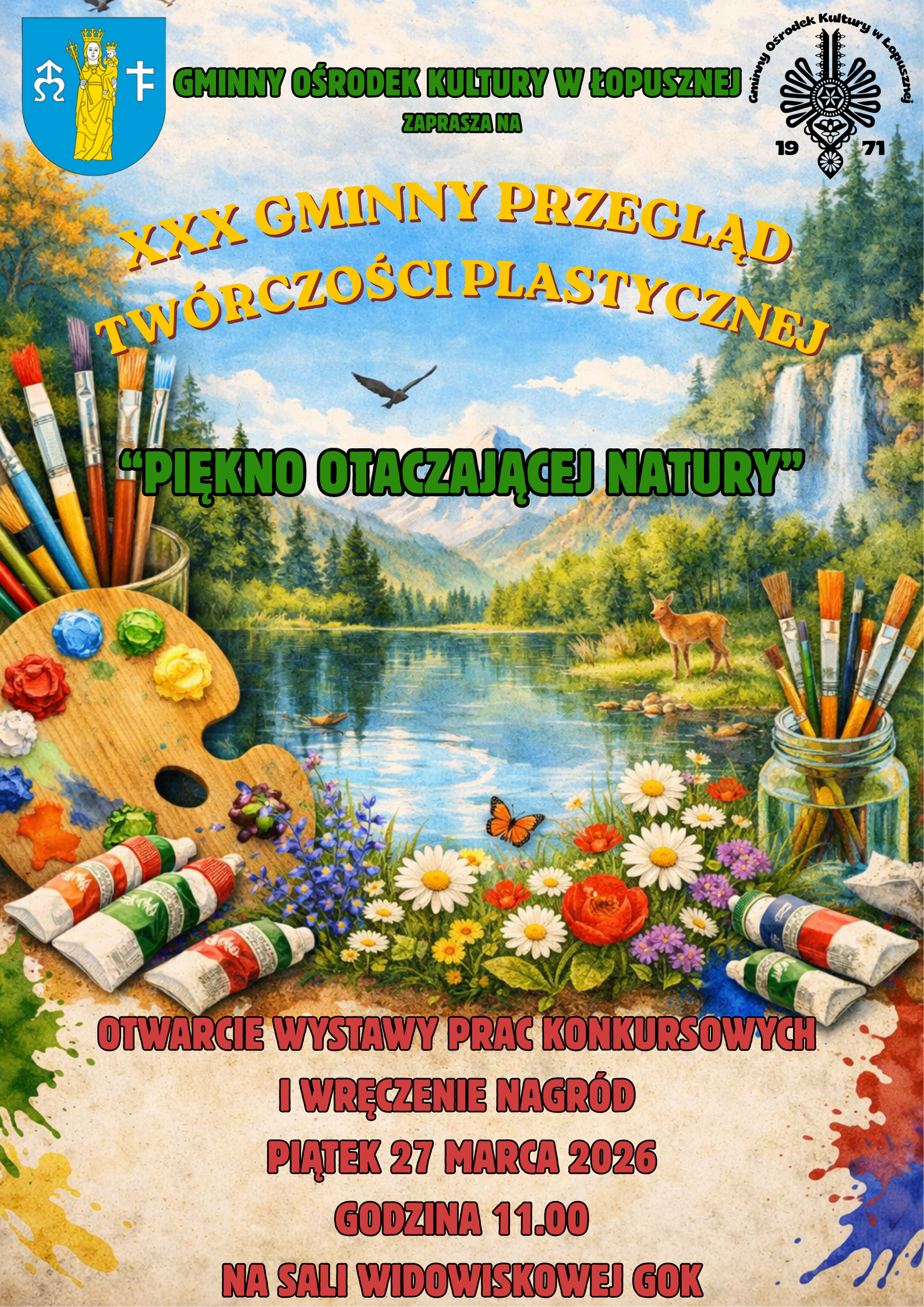 Otwarcie wystawy prac konkursowych oraz rozdanie nagród XXX Gminnego Przeglądu Twórczości Plastycznej "Piękno otaczającej natury" odbędzie się w piątek 27 marca 2026 o godzinie 11.00 na sali widowiskowej Gminnego Ośrodka Kultury w Łopusznej.