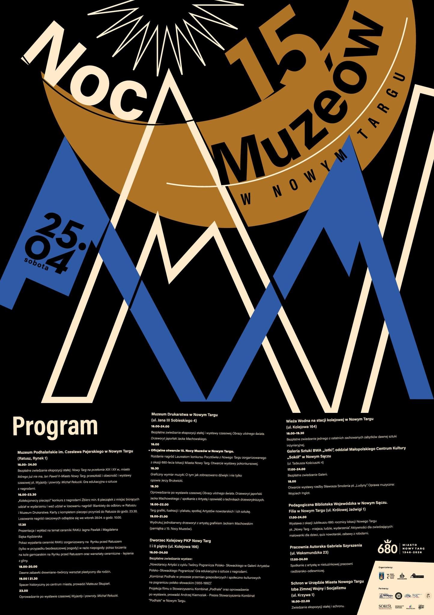 16.00 Oficjalne otwarcie 15. Nocy Muzeów w Nowym Targu. Rozdanie nagród Laureatom konkursu Pocztówka z Nowego Targu zorganizowanego z okazji 680-lecia lokacji Miasta Nowy Targ. Otwarcie wystawy pokonkursowej.