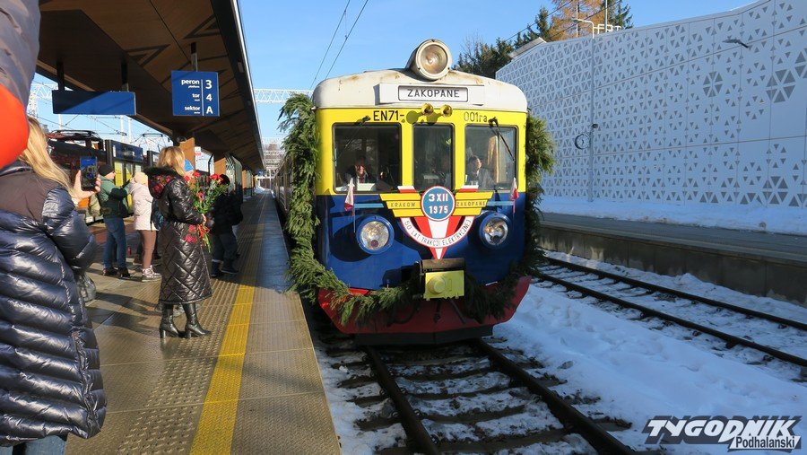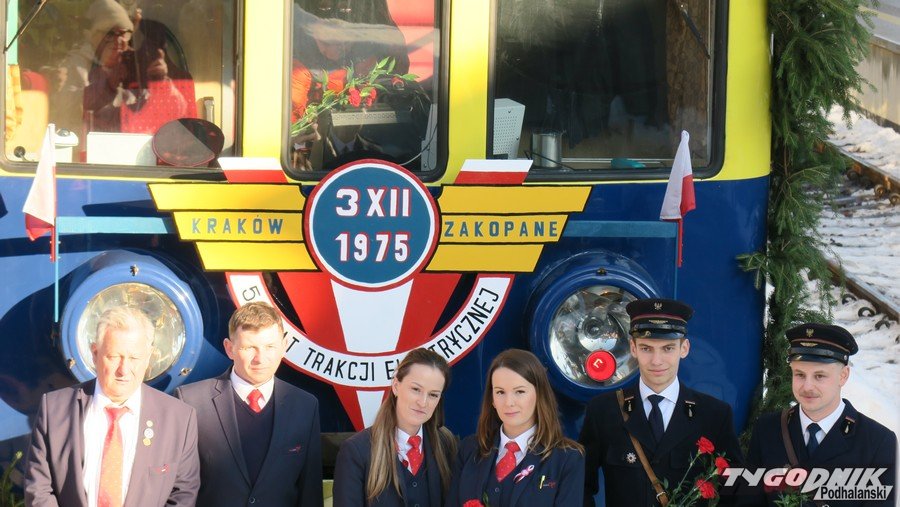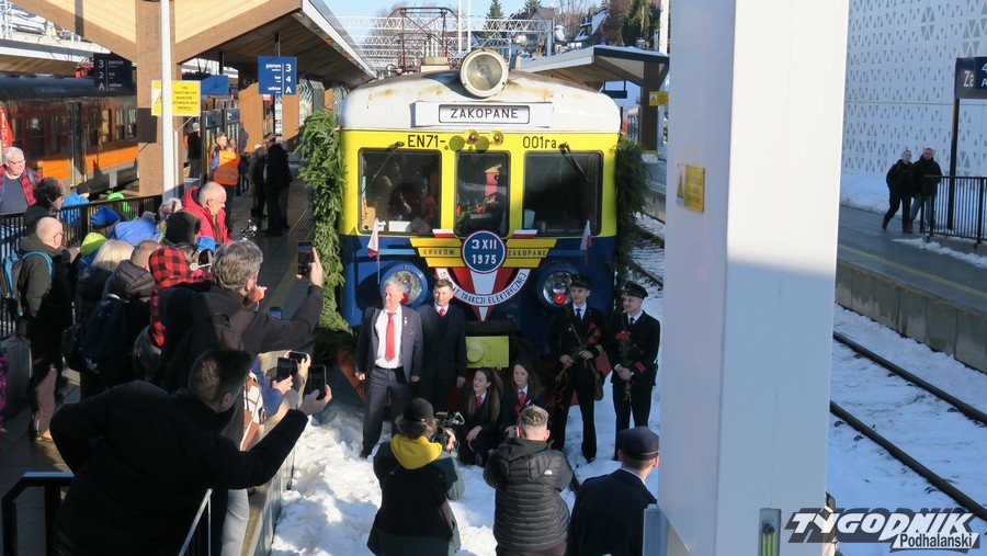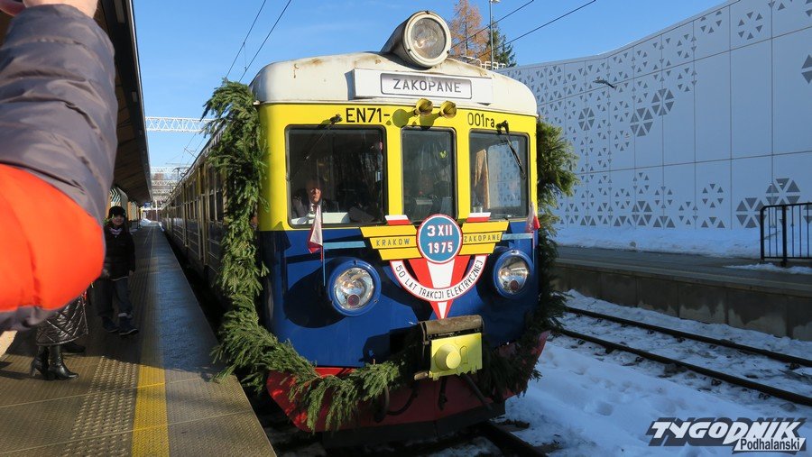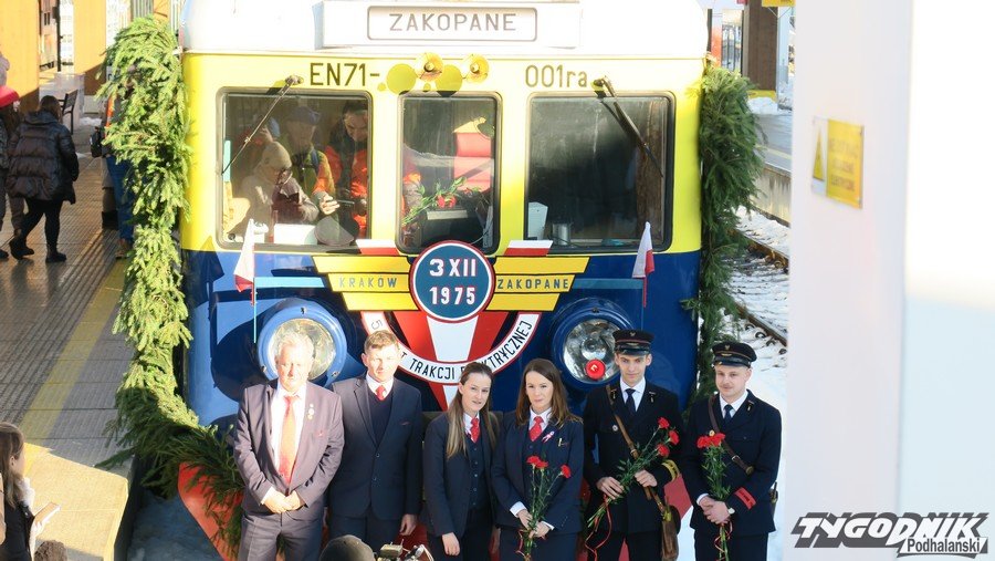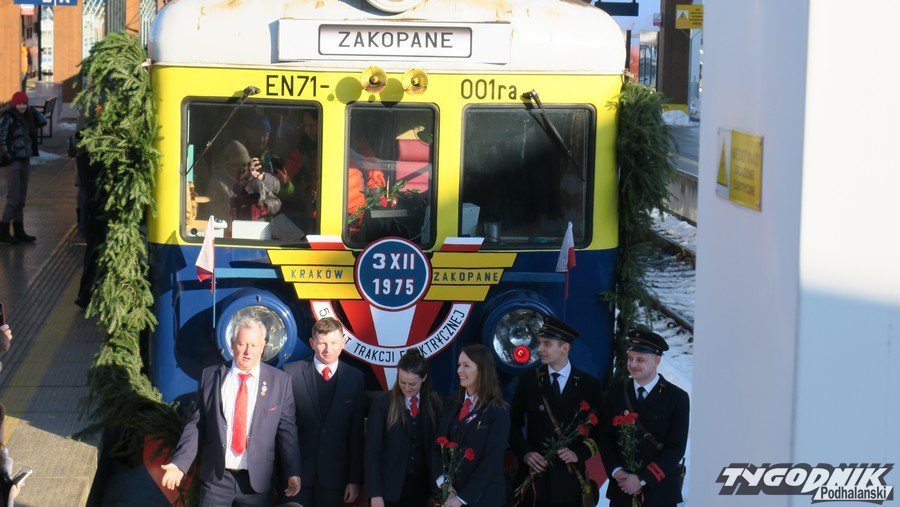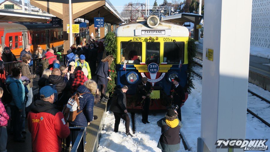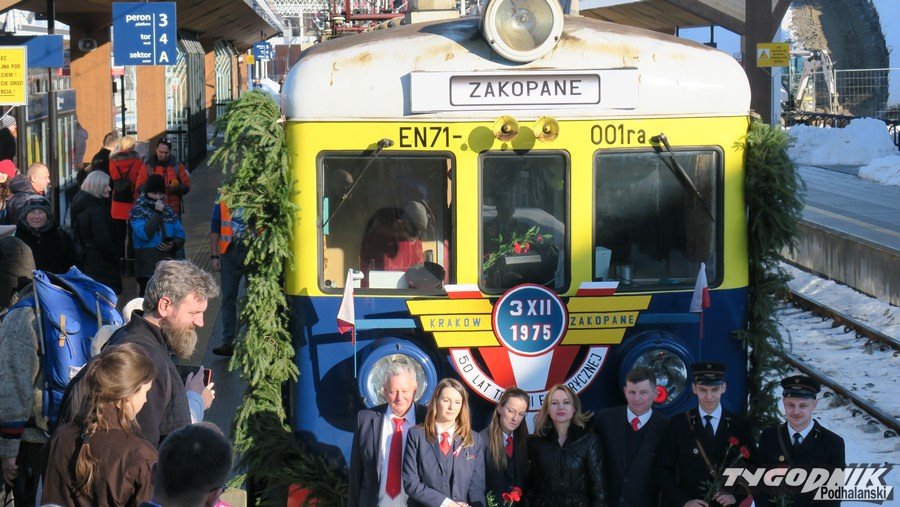 Powitanie historycznego pociągu retro z okazji 50. rocznicy elektryfikacji "Zakopianki". Na peron zajechał skład EN71-001 z załogą w historycznych mundurach. Ekipę wita Iwona Grzebyk-Dulak, a o historii opowiada Jakub Stawarz, członek Nowosądeckiego Stowarzyszenia Miłośników Kolei, dziś kierownik składu EN71-001, a także Apoloniusz Rajwa, który uwieczniał to wydarzenie na kolorowych slajdach.