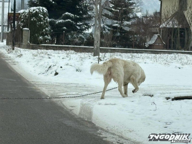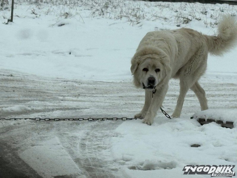 Duży owczarek podhalański z długim łańcuchem na szyi błąka się przy termach