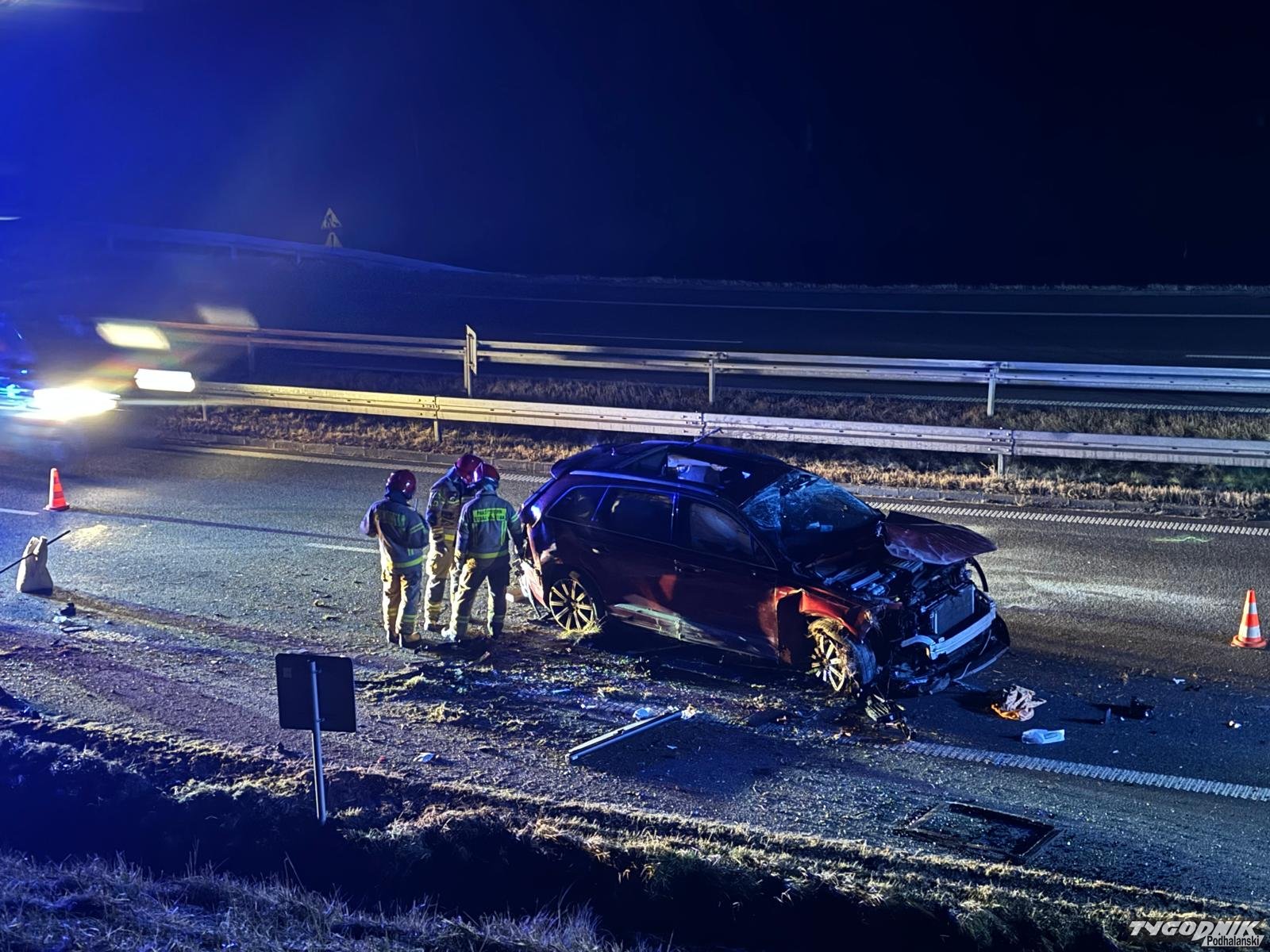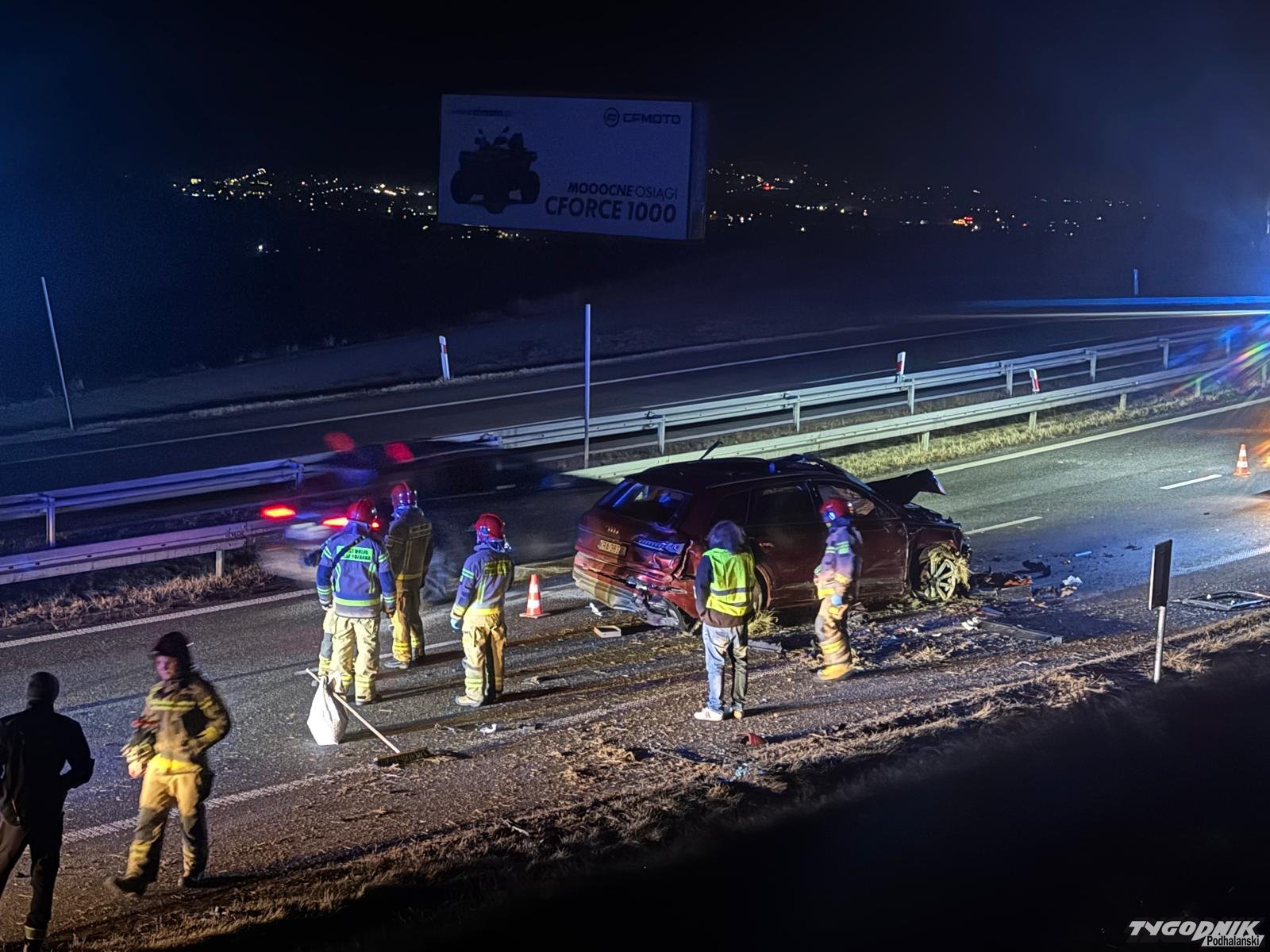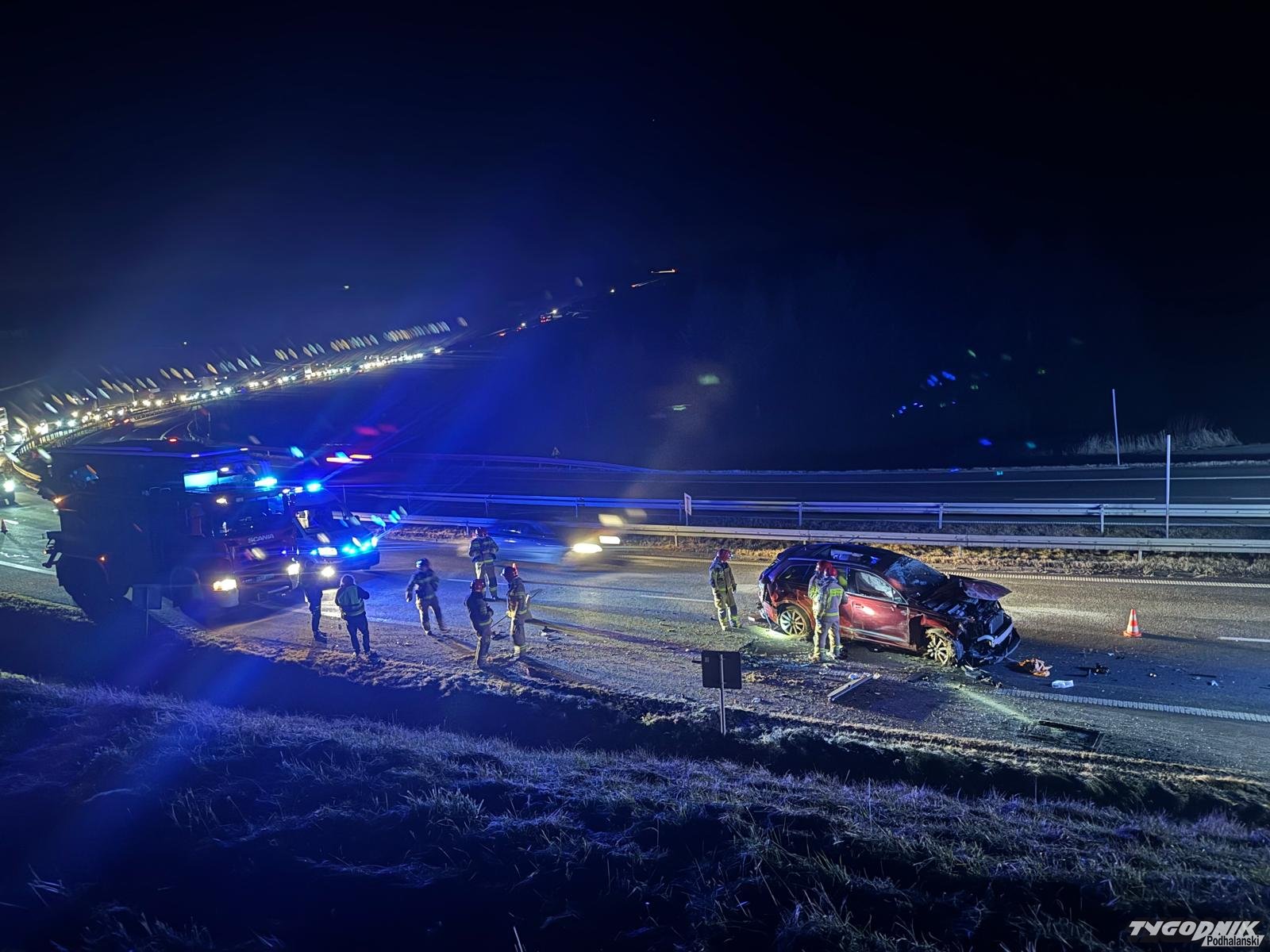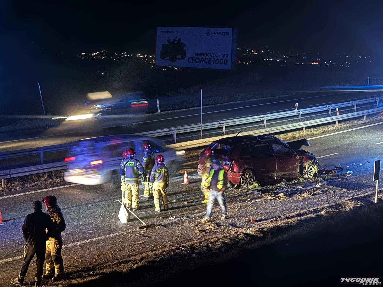 Auto wpadło do rowu przy pasie w kierunku Krakowa. Później pojazd wjechał na szosę. Samochód jest mocno rozbity. Na miejscu jest karetka pogotowia i strażacy. Początkowo ruch był wstrzymany, teraz odbywa się jednym pasem. Tworzą się korki.