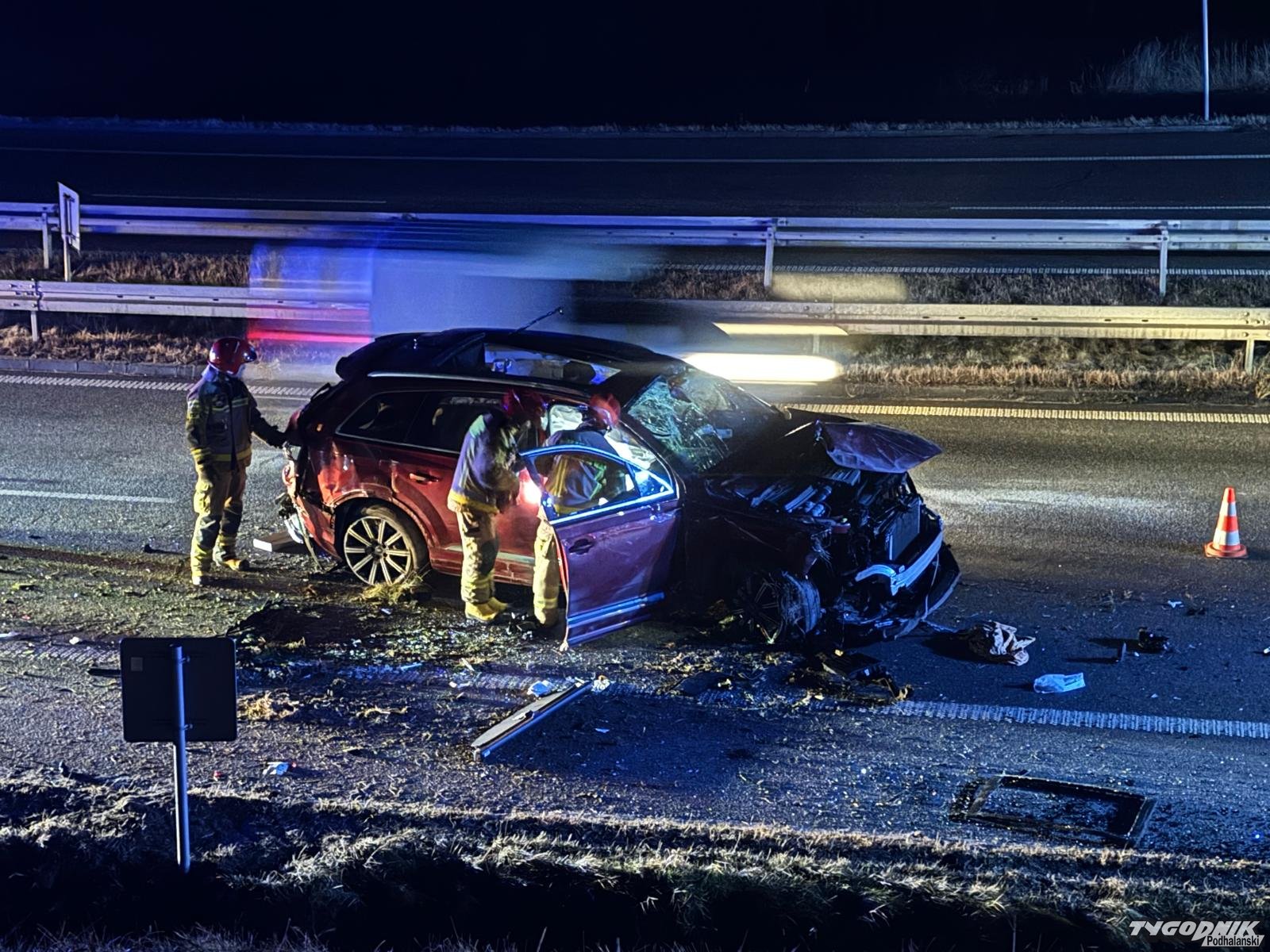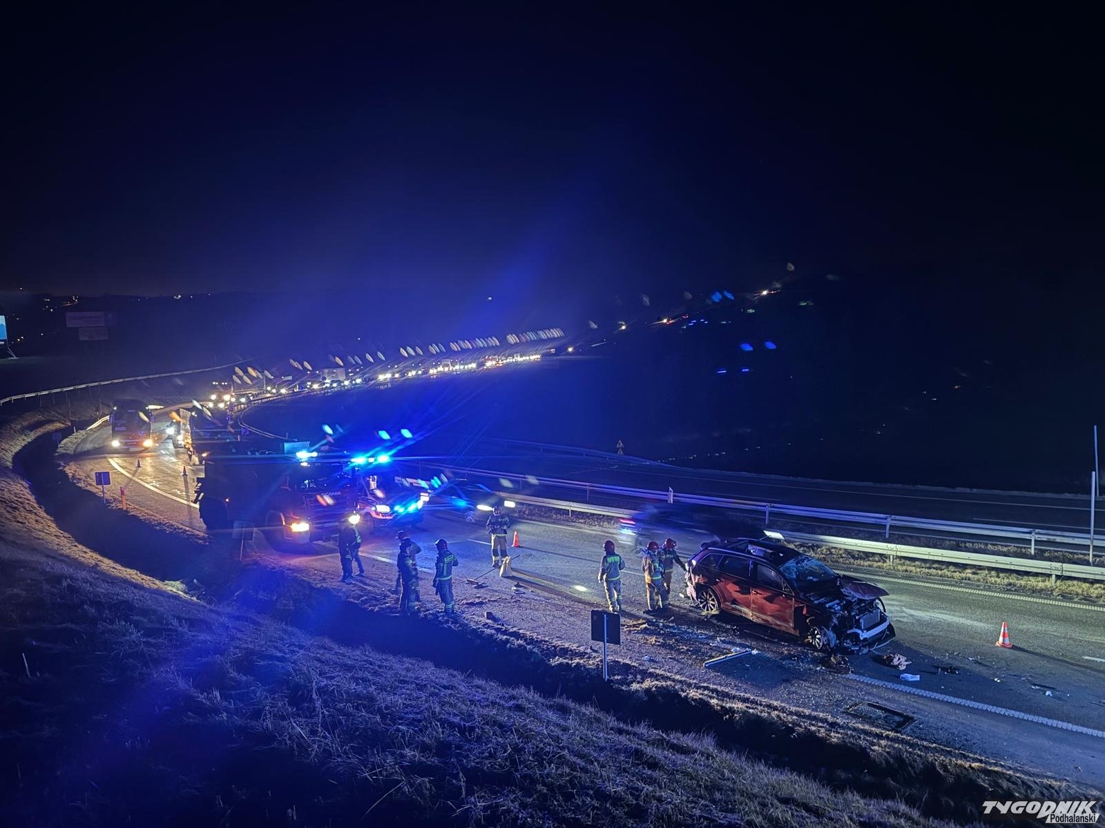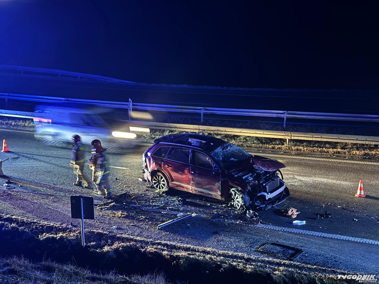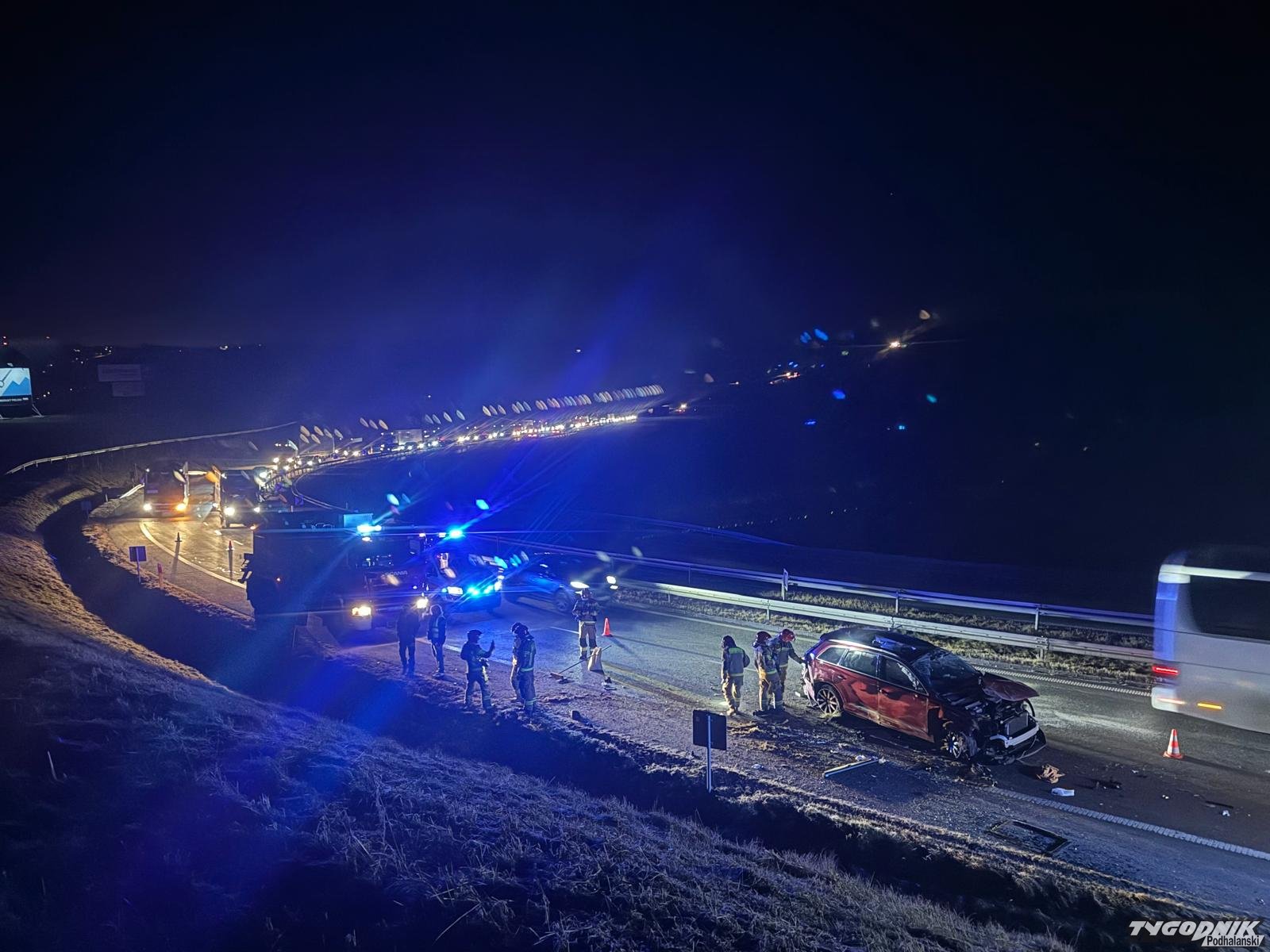 Auto wpadło do rowu przy pasie w kierunku Krakowa. Później pojazd wjechał na szosę. Samochód jest mocno rozbity. Na miejscu jest karetka pogotowia i strażacy. Początkowo ruch był wstrzymany, teraz odbywa się jednym pasem. Tworzą się korki.