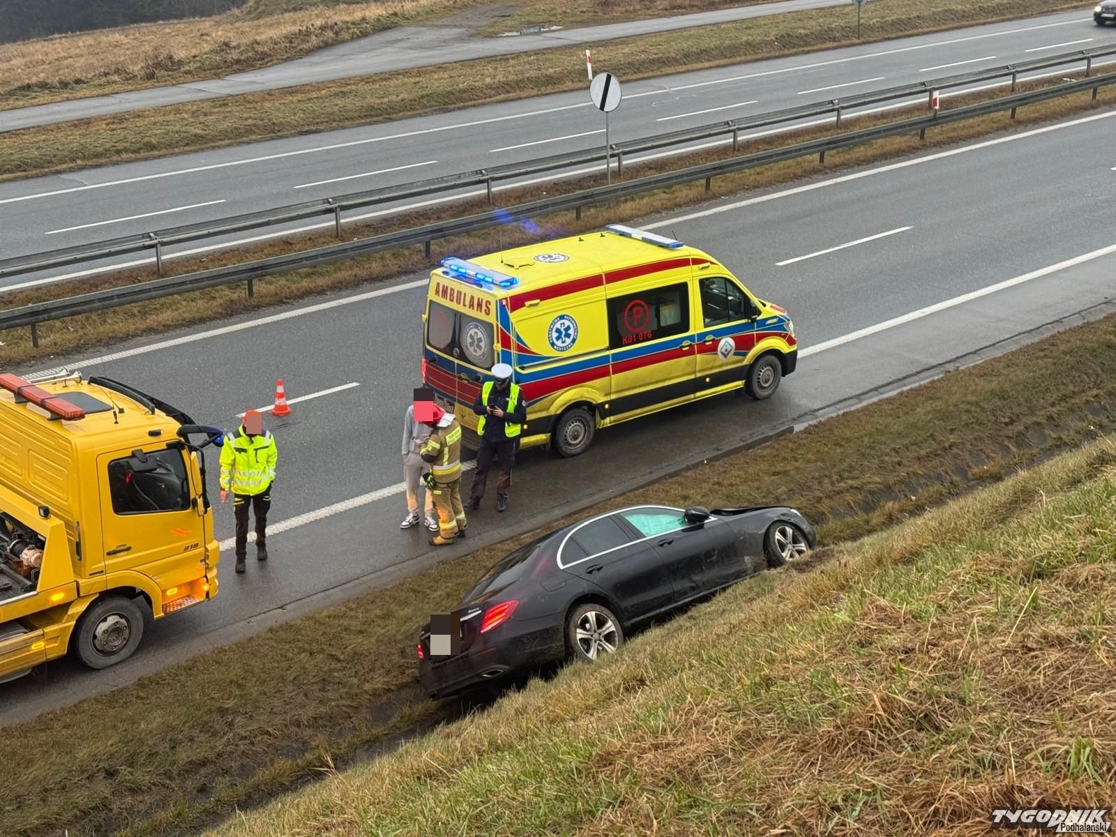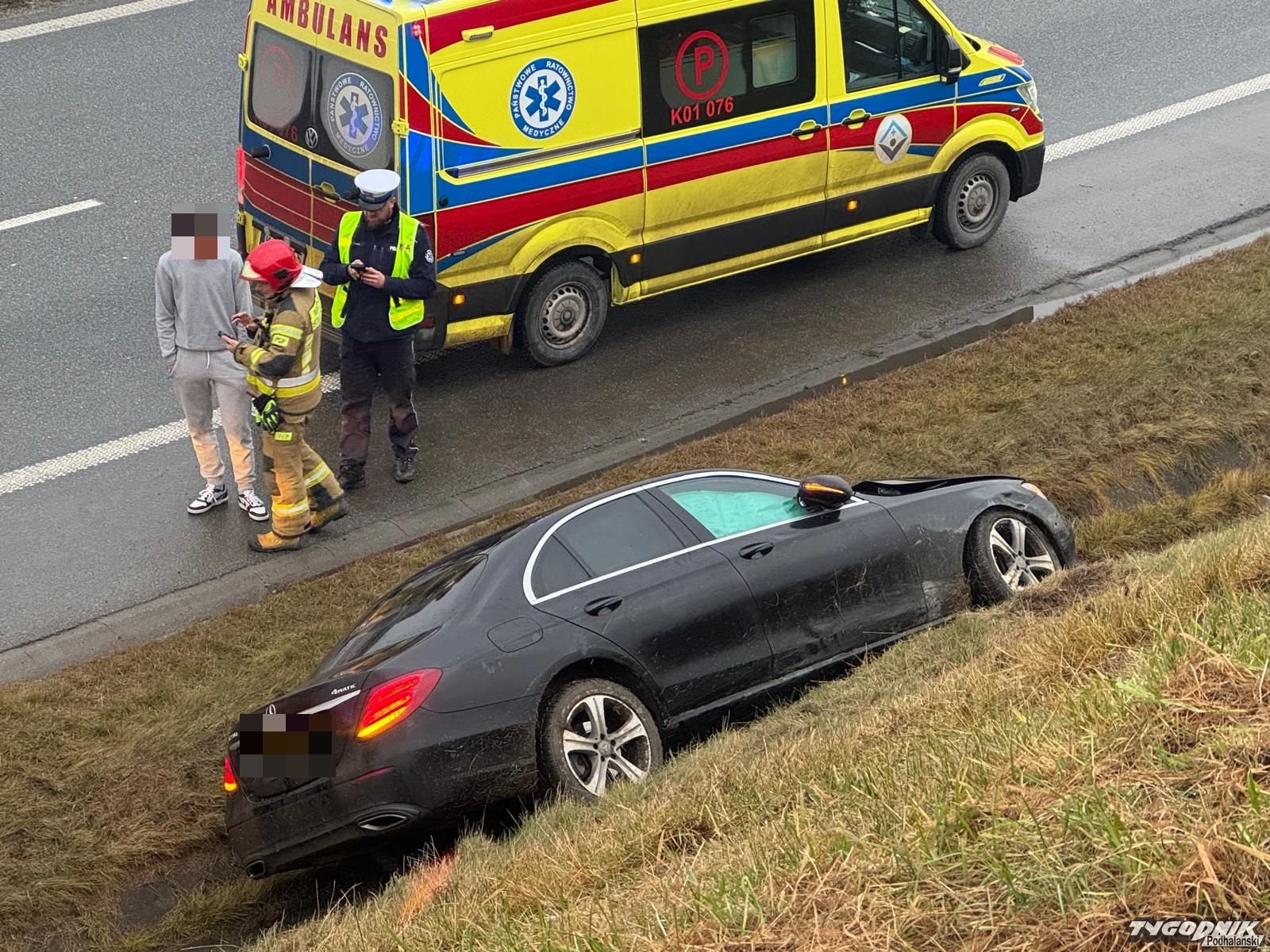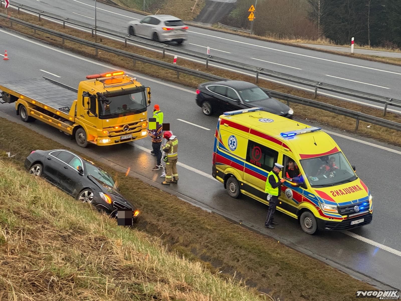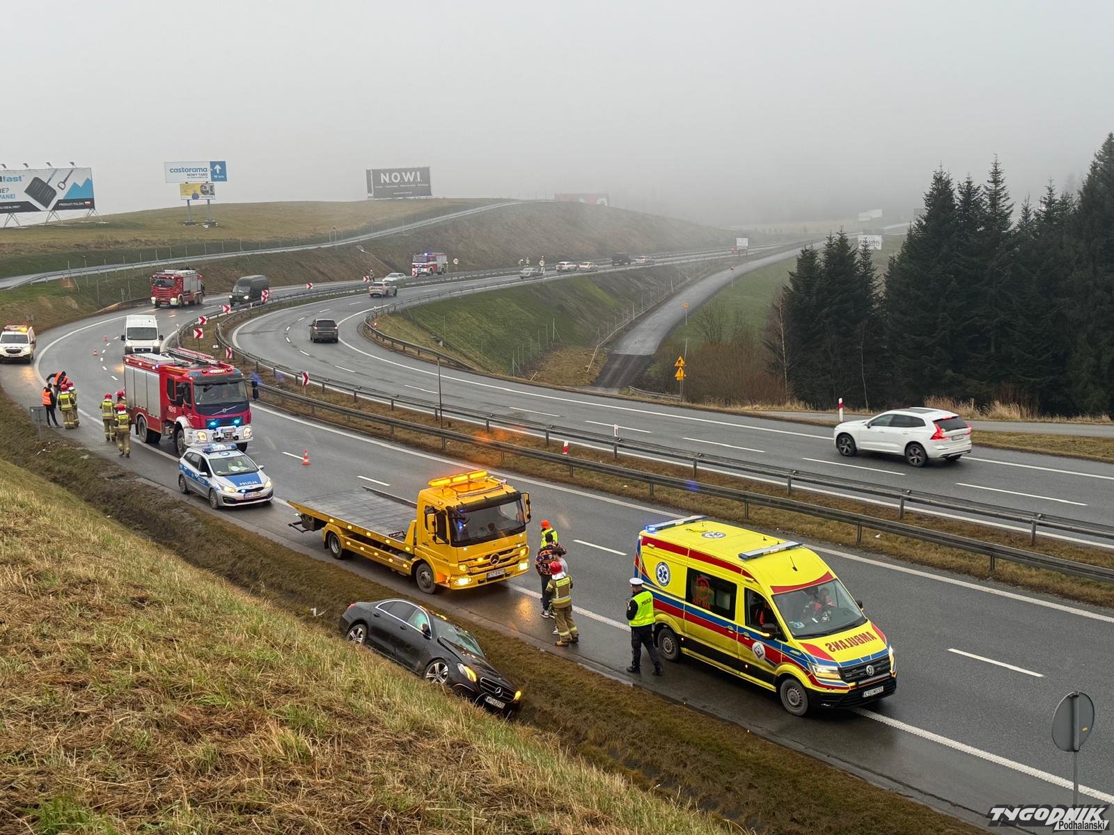 Wypadek zdarzył się na zakopiance, kilkaset metrów przed kościółkiem na Obidowej, na pasie w stronę Krakowa. Kierowca osobowego mercedesa stracił panowanie nad pojazdem, auto wjechało do rowu i uderzyło w skarpę. Na miejscu pracują strażacy i policjanci, jest też zespół pogotowia ratunkowego. Ruch odbywa się jednym pasem.