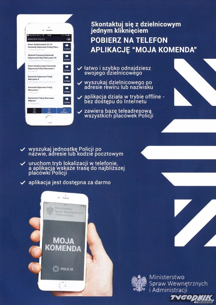 Drugim z narzędzi, które ułatwia kontakt z policjantami jest aplikacja Moja Komenda. Dzięki niej w łatwy i szybki sposób można się skontaktować ze swoim dzielnicowym. Aby to zrobić, wystarczy wpisać np. własne miejsce zamieszkania, a aplikacja odnajdzie funkcjonariusza, który dba o nasz rejon zamieszkania oraz pokaże, w której jednostce on pracuje. Dzielnicowych możemy wyszukać także po ich imieniu lub nazwisku. Użytkownik nie musi mieć dostępu do Internetu, aby odnaleźć swojego dzielnicowego.
