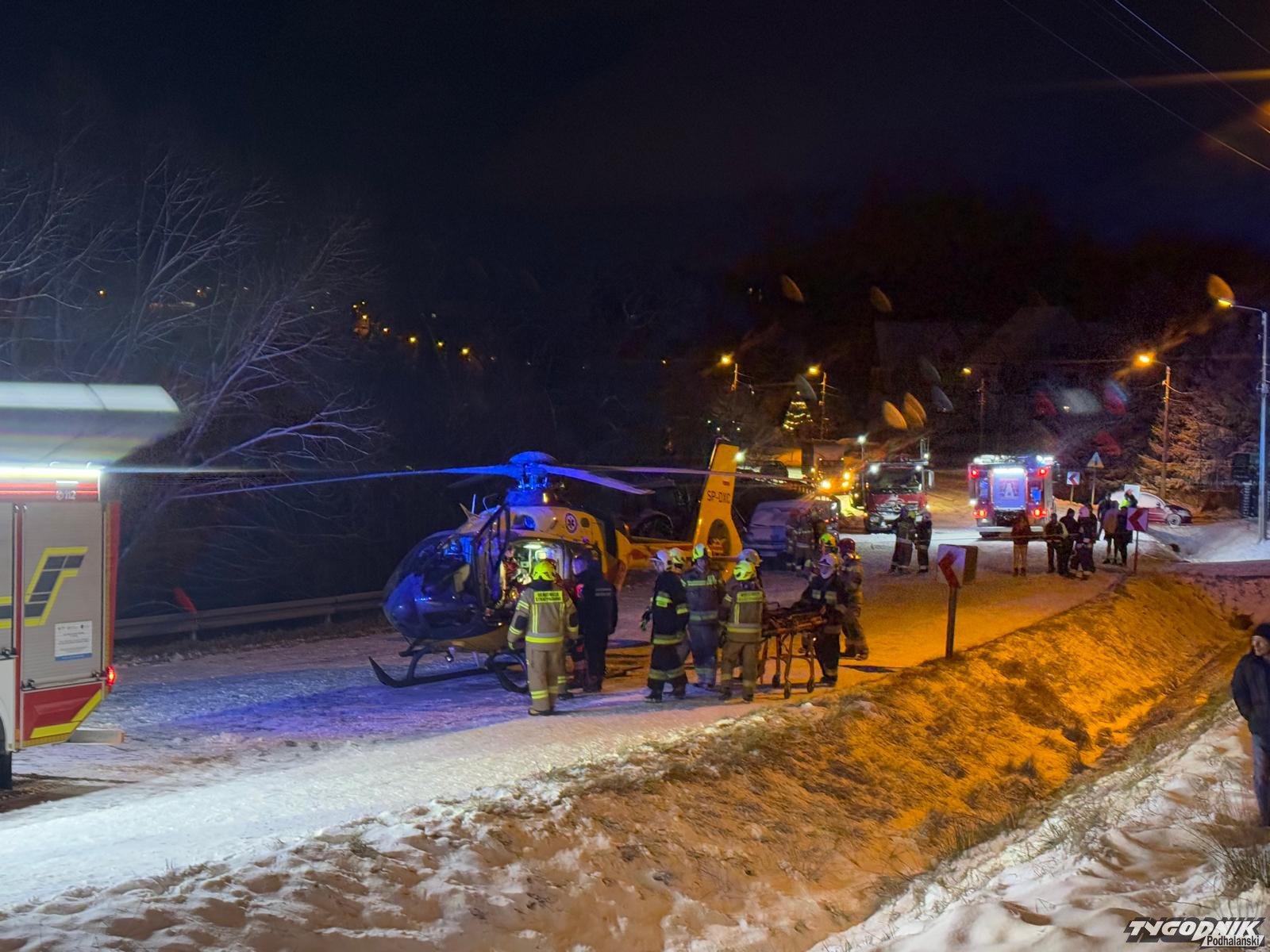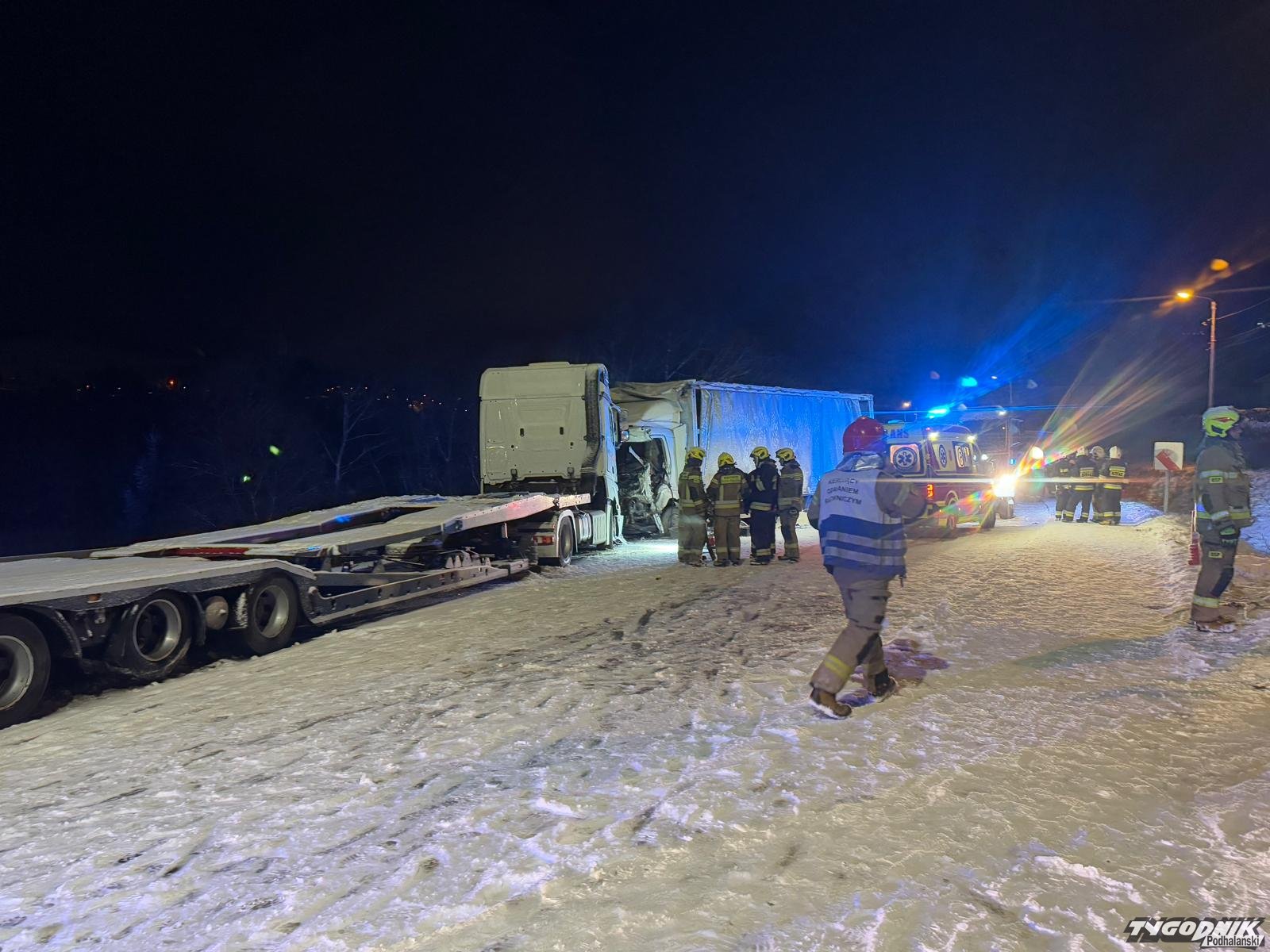 Według pierwszych informacji czołowo zderzyły się tam dwa tiry. Na miejscu pracują strażacy, policjanci, zespoły ratownictwa medycznego. Wezwano również śmigłowiec ratunkowy, który wylądował na drodze. Ok. godz. 17:15 śmigłowiec zabrał rannego kierowcę do szpitala. W sumie ranne zostały dwie osoby. Trasa prowadząca przez Jabłonkę jest całkowicie zablokowana. Apelujemy do kierowców o ostrożność. Na drogach panują coraz trudniejsze warunki.