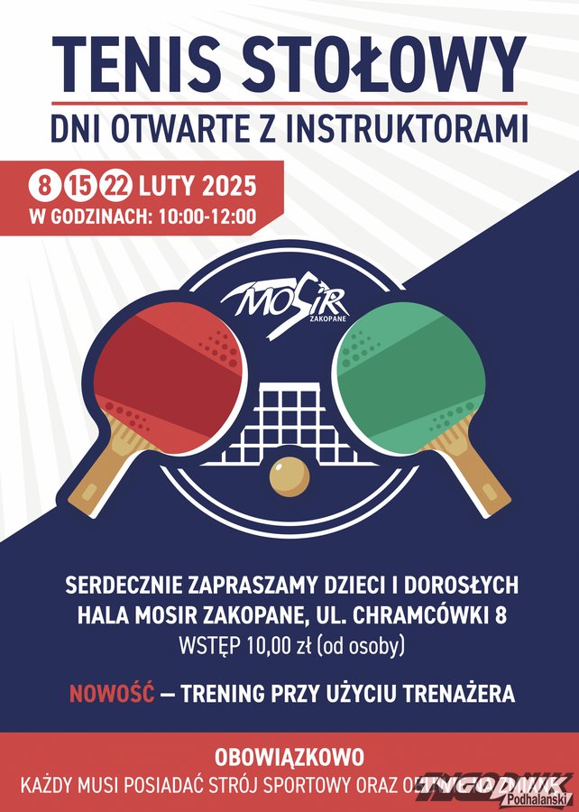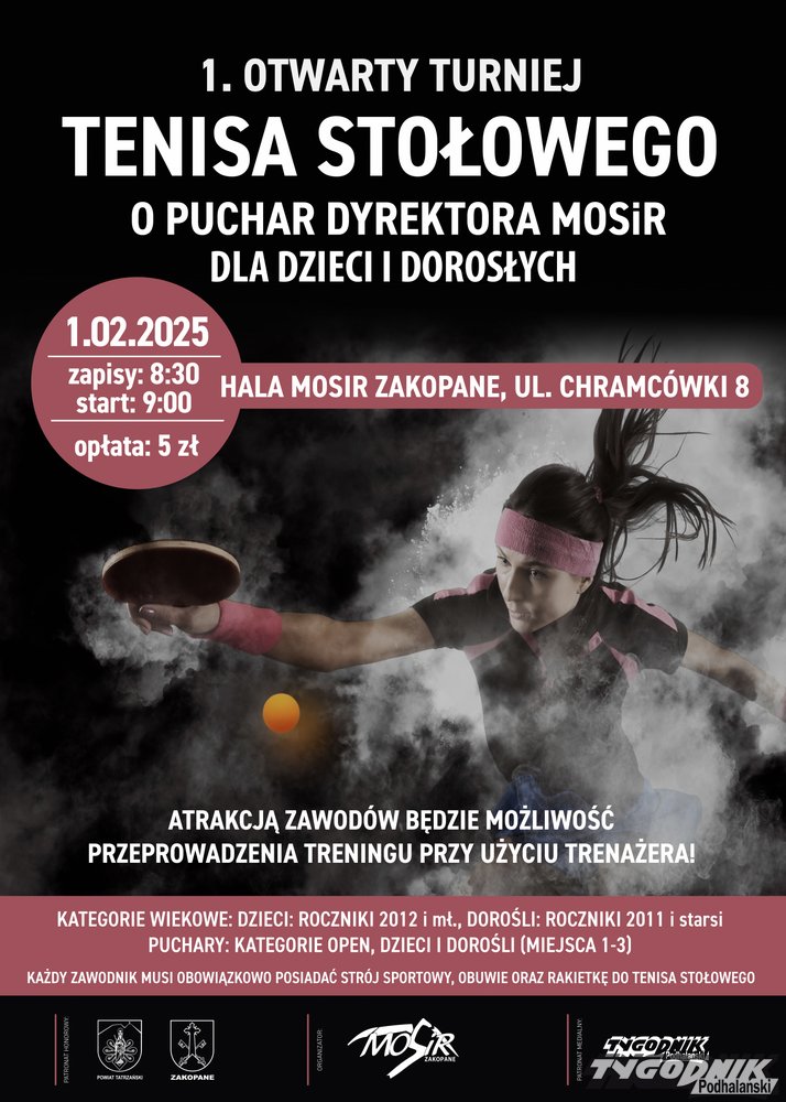 Serdecznie zapraszamy dzieci, młodzież oraz dorosłych na I Otwarty Turniej Tenisa Stołowego o Puchar Dyrektora MOSiR, który odbędzie się 1 lutego 2025 r. w budynku Hali Sportowej MOSiR przy ul. Chramcówki 8 w Zakopanem.