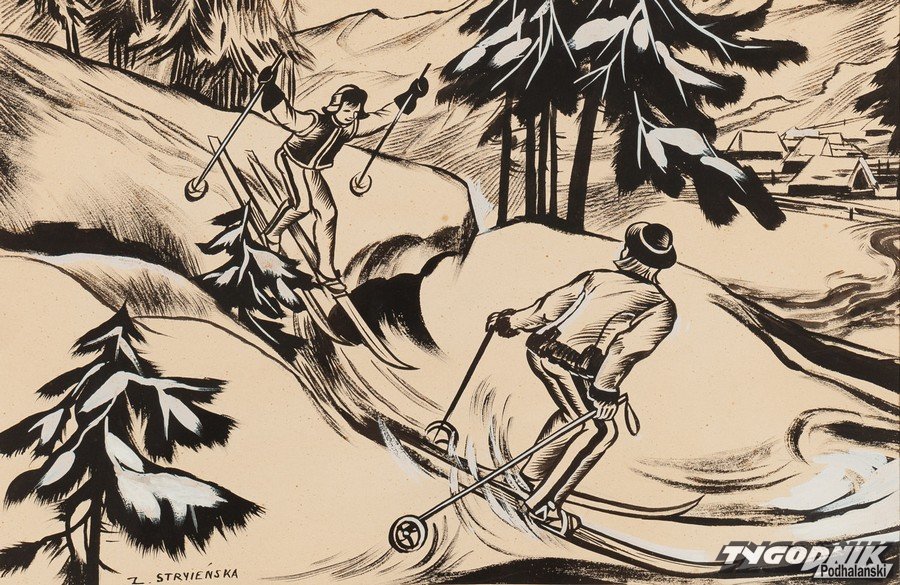 Raz odkryta sztuka zakopiańska miała niebagatelny wpływ na kształtowanie się polskiej tożsamości. Góralski folklor pełnił rolę spoiwa łączącego Polaków po latach podziału pomiędzy trzema zaborami i wkrótce został okrzyknięty stylem narodowym. Jego założenia zostały zaprezentowane w praktyce sto lat temu, podczas Międzynarodowej Wystawy Sztuki Dekoracyjnej i Wzornictwa w Paryżu. Pawilon polski projektu Józefa Czajkowskiego łączył nowoczesność ze wspomnianym stylem narodowym, a mariaż polskich dworków z elementami sztuki zakopiańskiej zaowocował narodzinami polskiego art déco. Pomimo głosów krytyki, polscy artyści wrócili do kraju z aż 205 nagrodami, w tym 70 złotymi medalami i 35 Grand Prix. Cztery z nich trafiły w ręce Zofii Stryjeńskiej, jednej z najważniejszych postaci zakopiańskiej sceny artystycznej. Na tegorocznej wystawie w DESA Unicum, obok czterech charakterystycznych grafik i międzywojennego kilimu, znajdziemy jej pracę „Narciarze”, wykonaną w latach 40. XX w. najprawdopodobniej do reklamy kawy Enrilo dla fabryki Henryka Francka Synowie w Skawinie.