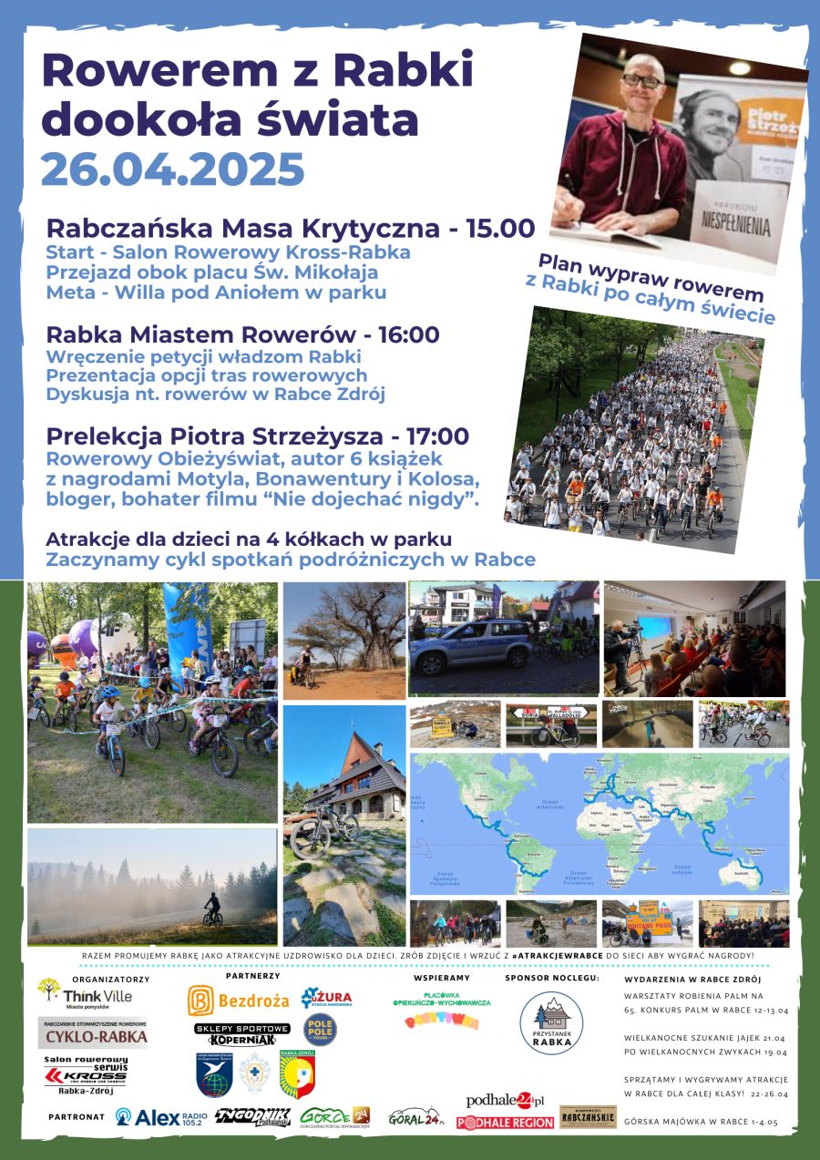 Przed nami wydarzenie "Rowerem z Rabki dookoła świata" - Rabczańska Masa Krytyczna i prelekcja Piotra Strzeżysza.