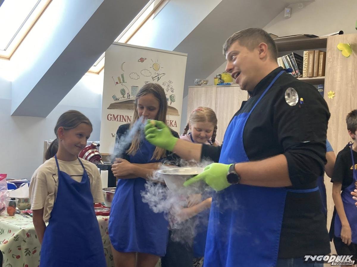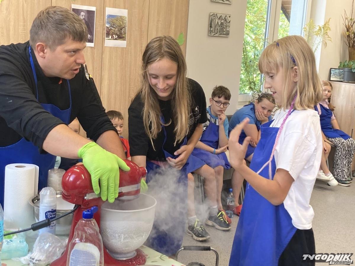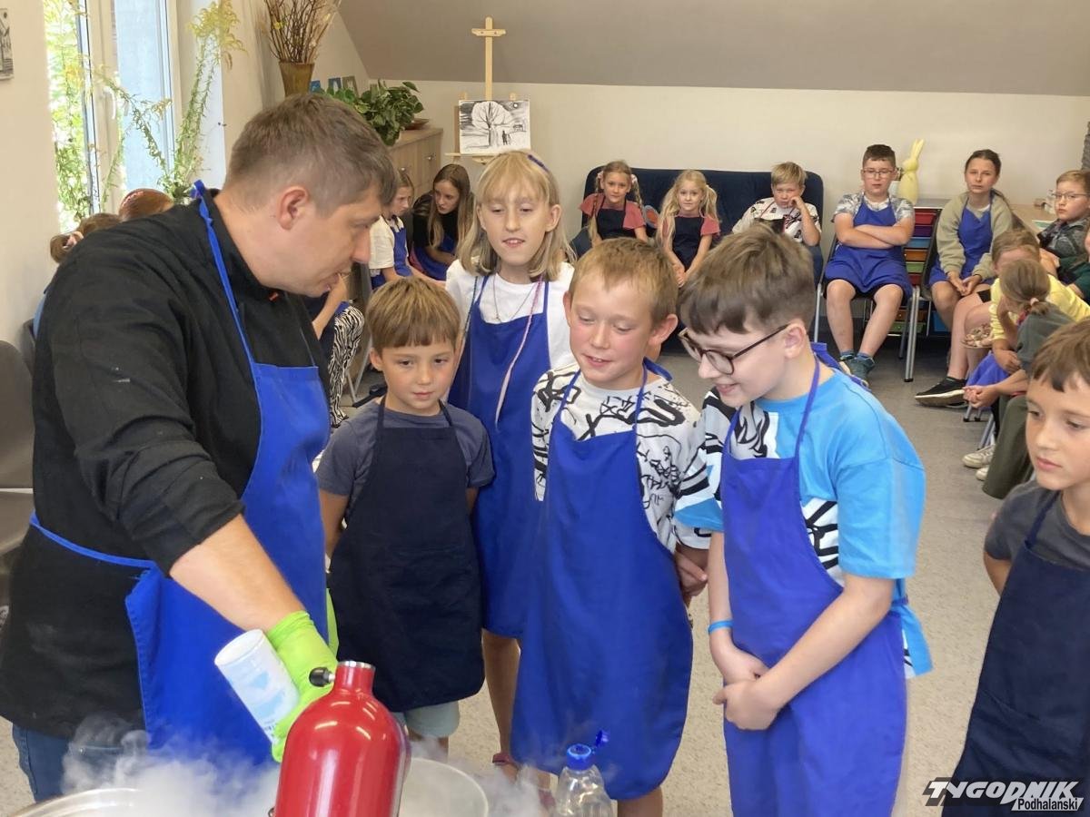Dzieci odkrywały fascynujące właściwości suchego lodu i ciekłego azotu, obserwując eksperymenty. Szef kuchni Paweł Olkowski udowodnił, że naukę można zamienić w prawdziwy spektakl - zamrażał kwiaty na oczach dzieciaków i serwował chrupki przemienione w "smocze przysmaki".