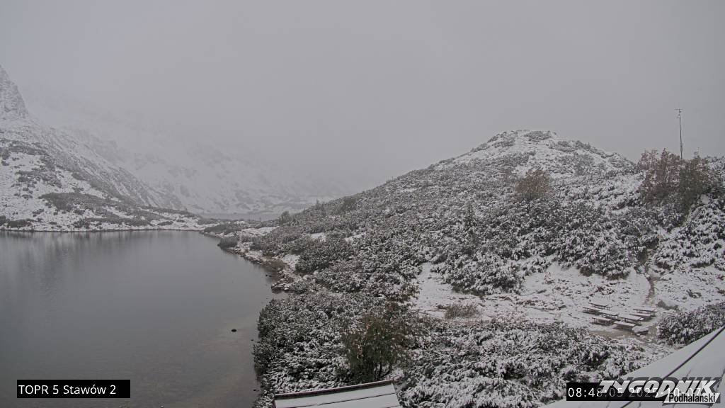 Na Kasprowym temperatura poniżej zera i pada śnieg. Opady śniegu i śniegu z deszczem występują teraz w Tatrach od wysokości ok 1600-1700 metrów. Niżej pada deszcz. Według prognoz opady będą zanikać dopiero w nocy. Środa ma być jedynym w tym tygodniu dniem bez deszczu. Jest szansa na przejaśnienia i słońce, szczególnie w godzinach popołudniowych. Niestety, w czwartek znowu zapowiadane są opady. Na razie poprawy pogody i złotej tatrzańskiej jesieni w prognozach nie widać.