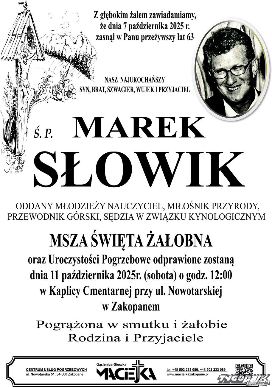 O śmierci Marka Słowika na swoim profilu poinformowało Stowarzyszenie Absolwentów Liceum im. Oswalda Balzera. Pogrzeb zmarłego odbędzie się w sobotę 11 października o godz. 12 na cmentarzu przy ul. Nowotarskiej.