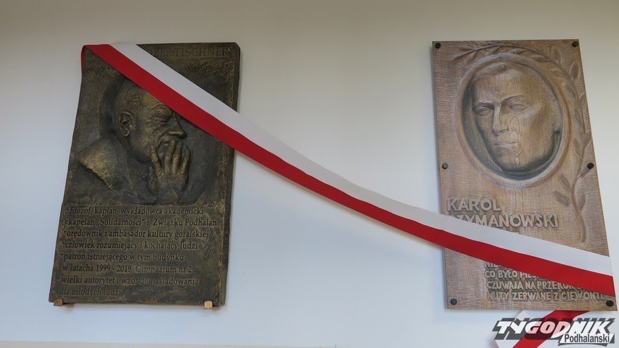 Tablica przed budynkiem i dwie tablice w korytarzu przypominają historię miejsca i patronów, których imię nosiły działające tu placówki.