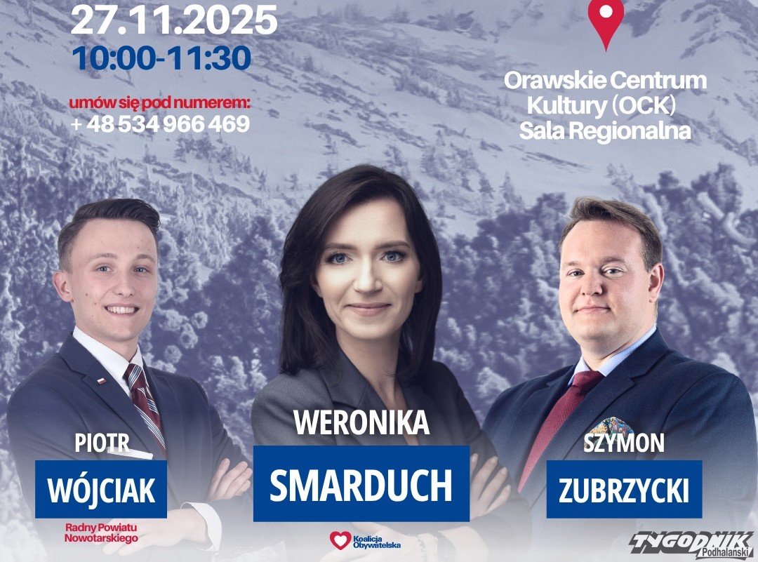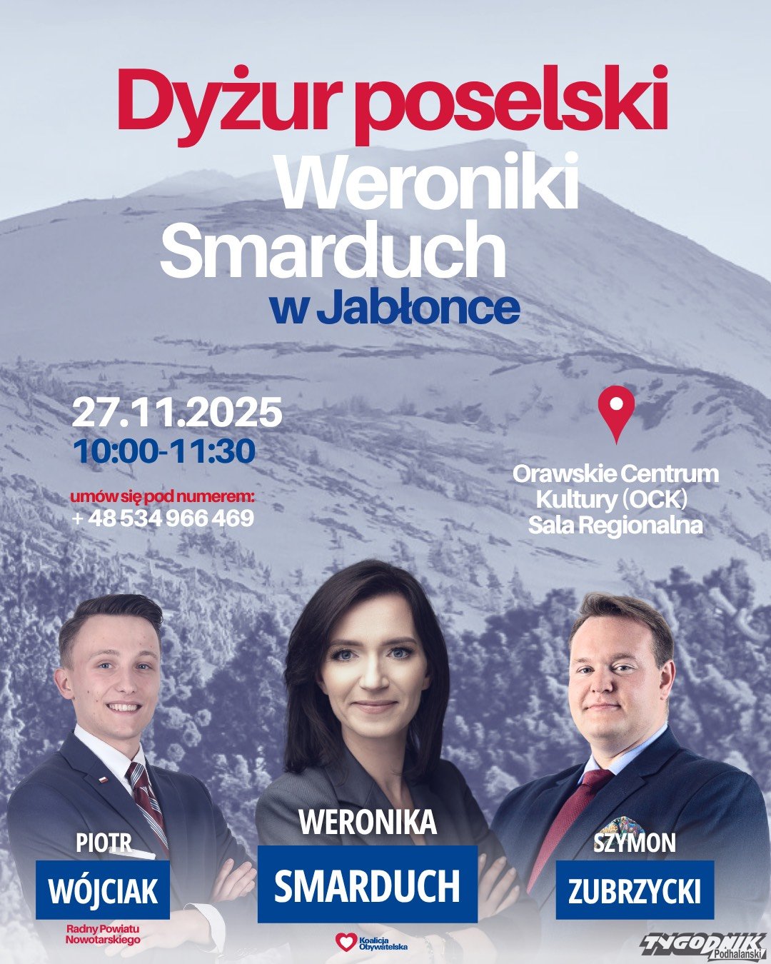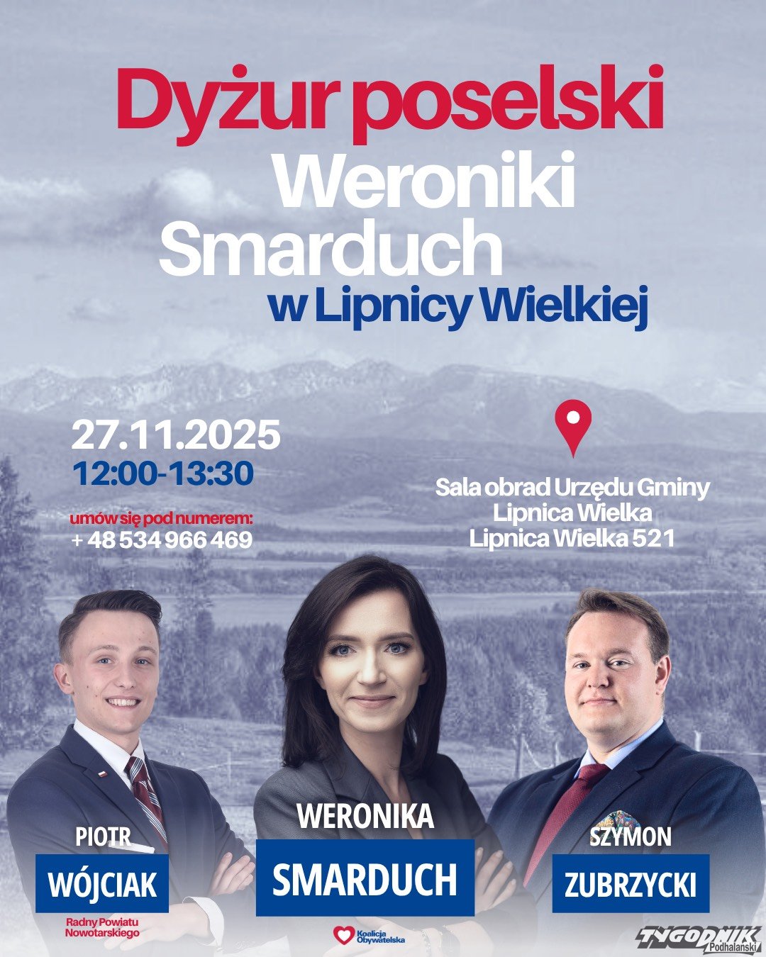 Posłanka na Sejm RP Weronika Smarduch zaprasza mieszkańców gmin Jabłonka oraz Lipnica Wielka na dyżury poselskie, które odbędą się w czwartek, 27 listopada. W spotkaniach wezmą udział również radny Powiatu Nowotarskiego Piotr Wójciak oraz Szymon Zubrzycki.