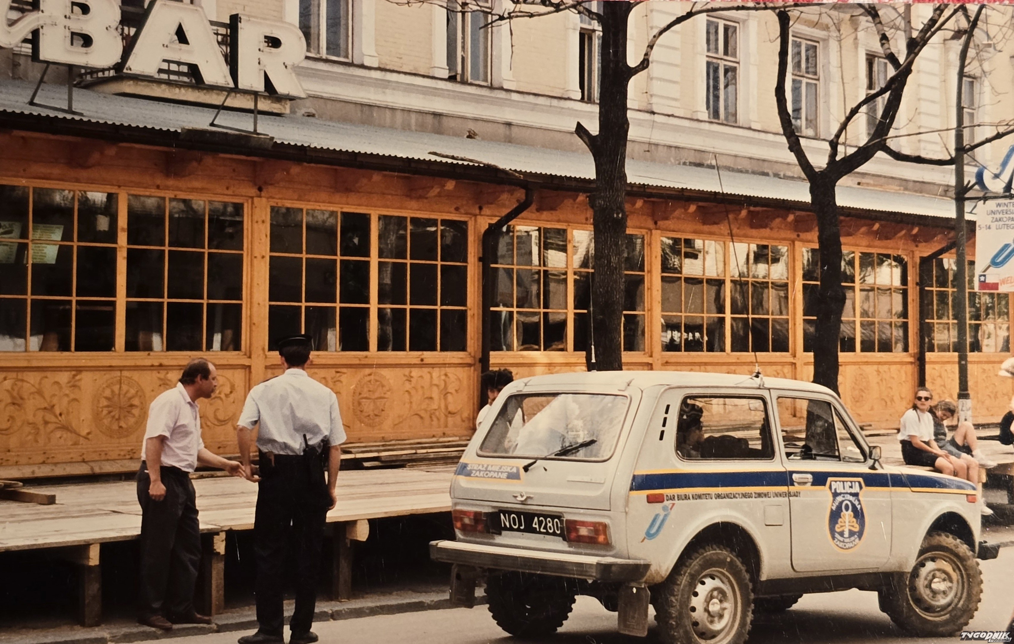 Nowy samochód szybko poszedł w teren. Jedną z pierwszych interwencji, do których dotarli nim zakopiańscy strażnicy, był wyjazd przed budynek Morskiego Oka przy Krupówkach. Na miejscu czekała ich gorąca scena — Andrzej Stoch, znany przedsiębiorca, z determinacją bronił budowy tymczasowego tarasu dla swojego baru (Na zdjęciu) . „Takie były czasy” – wspominają dziś dawni funkcjonariusze, pamiętający pionierskie, często chaotyczne lata działania formacji.