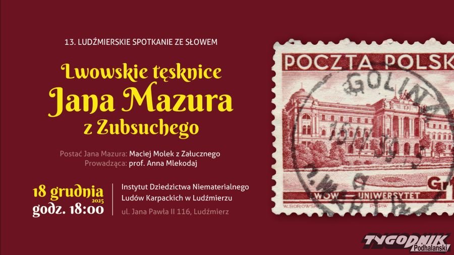W ramach cyklu "Ludźmierskie Spotkania ze Słowem" Małopolskie Centrum Kultury SOKÓŁ w Nowym Sączu oraz Związek Podhalan Oddział w Ludźmierzu serdecznie zapraszają na spotkanie poetyckie pt. "Lwowskie tęsknice Jana Mazura z Zubsuchego". Wydarzenie odbędzie się w czwartek 18.12 o godz. 18 w Domu Podhalańskim - Instytucie Dziedzictwa Niematerialnego Ludów Karpackich w Ludźmierzu.