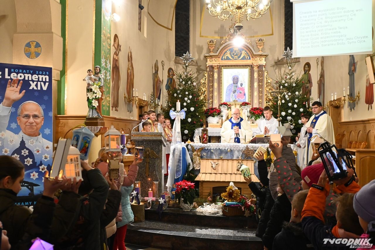 Ostatnie roraty w parafii NMP Królowej Polski w Miętustwie rozpoczęły się punktualnie o godzinie siódmej rano. Tradycyjnie podczas śpiewu "Chwała na wysokości" mali górale podnieśli w górę lampiony. Wszystkich licznie zgromadzonych wiernych powitał ks. proboszcz Janusz Rzepa. - Bogu dziękujemy za ten czas przygotowania na Boże Narodzenie. Jestem wam bardzo wdzięczny za obecność na roratach, za pomoc w dotarciu dzieciom, którą okazali rodzicie, dziadkowie - dodał ks. Rzepa.