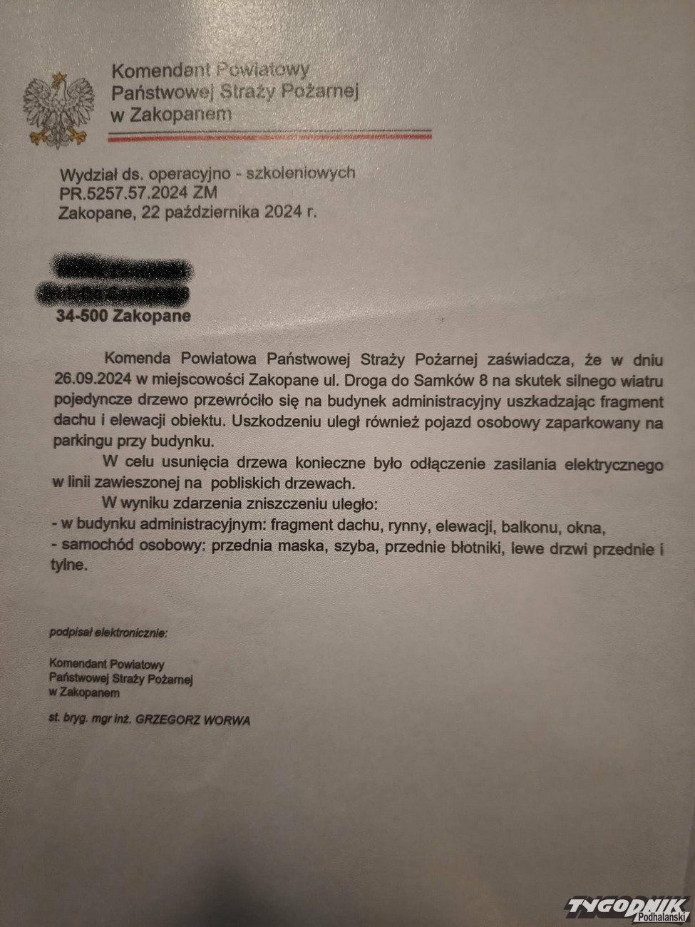 Odpowiadając urzędnikom mieszkaniec Zakopanego pokazuje pismo podpisane przez ówczesnego komendanta Straż Pożarnej, w którym napisał on, że aby usunąć drzewo konieczne było odłączenie zasilania elektrycznego w linii zawieszonej na drzewach. Wskazuje to na to, że linia w momencie, gdy drzewo zostało powalone znajdowała się pod napięciem - pismo znajdziecie wśród zdjęć obok.
