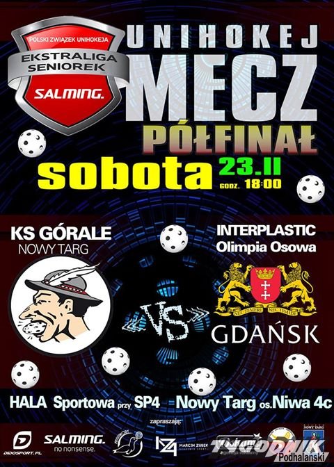 W sobotę o godz. 18 seniorki zespołu unihokejowego KS Górale Nowy Targ w półfinale Ekstraligi Seniorek zmierzą się z zespołem Interplastic Olimpia Osnowa Gdańsk. Mecz odbędzie się w hali szkoły podstawowej nr 4 w Nowym Targu na Niwie.