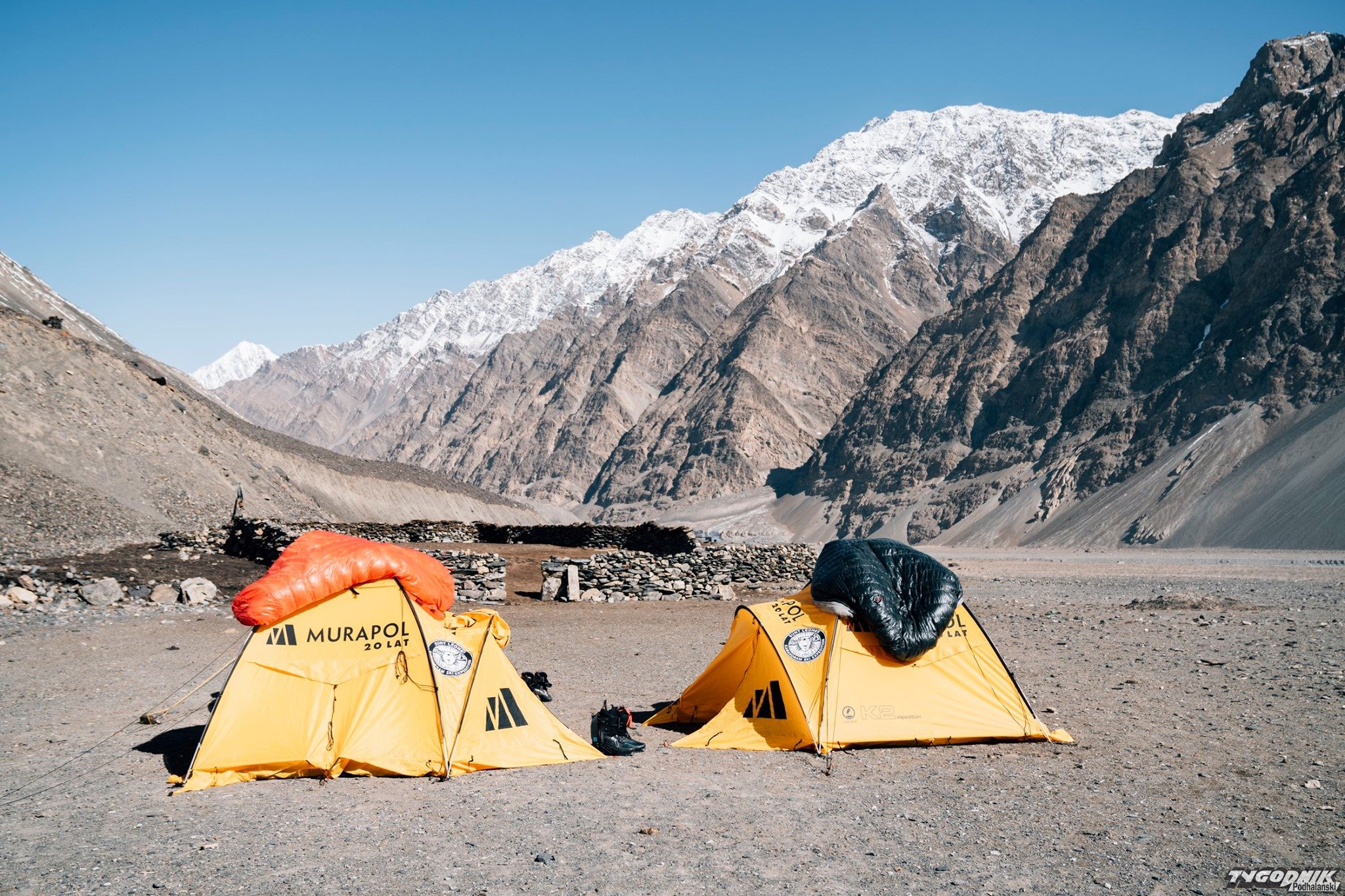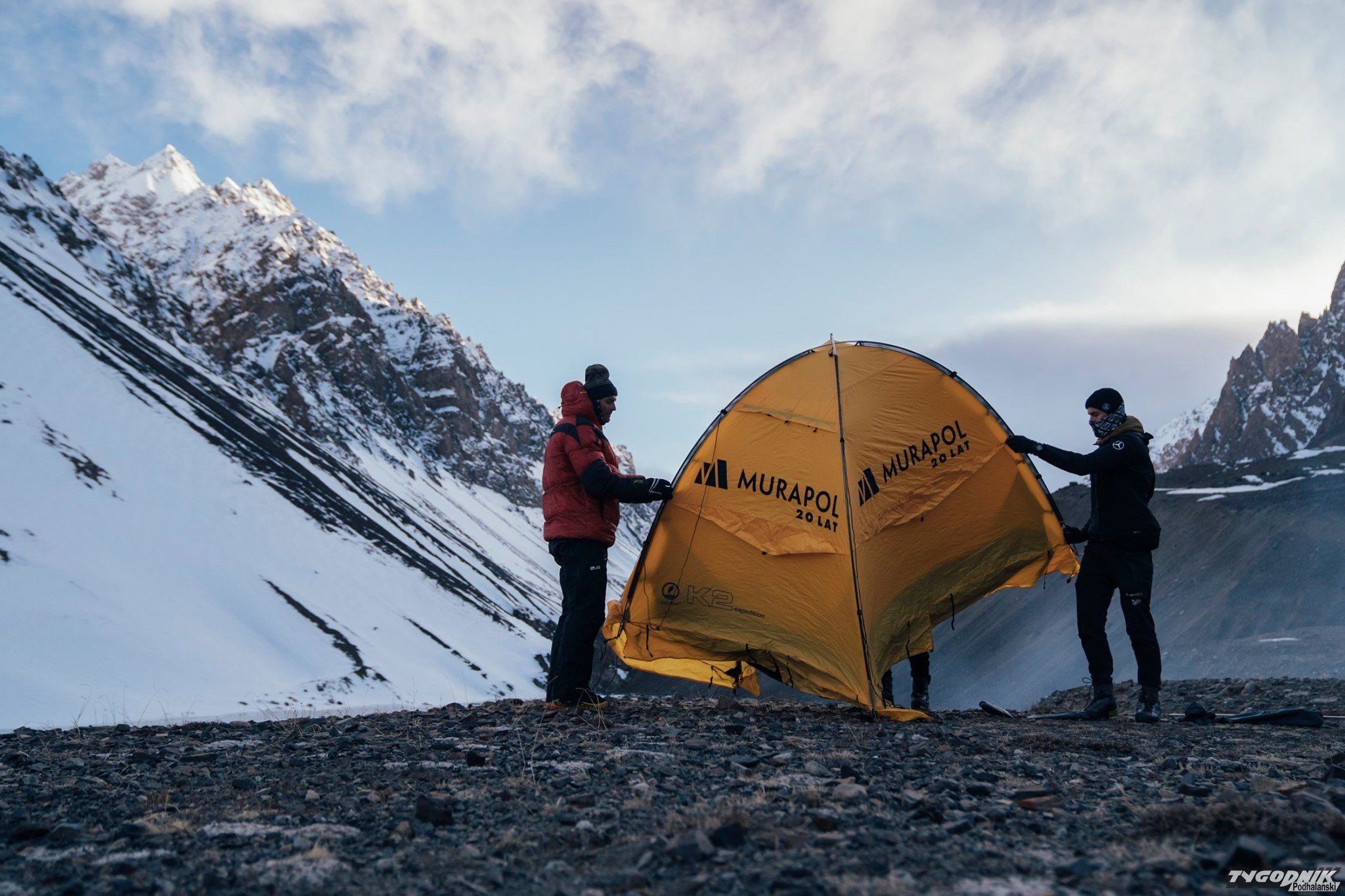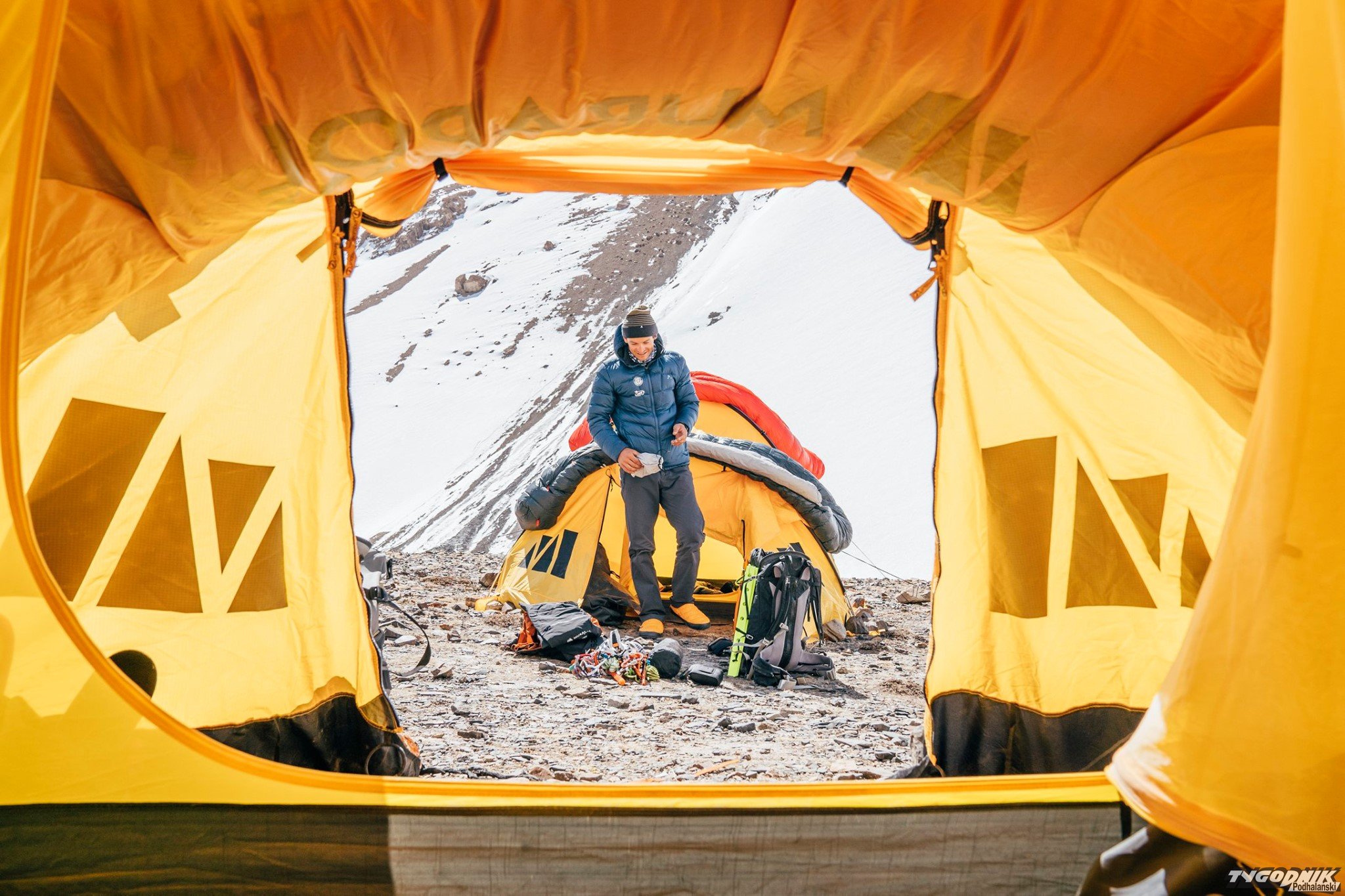 "Po pokonaniu przełęczy rozłożyliśmy obóz kilkaset metrów niżej, gdzie nie było śniegu a temperatura była nieco wyższa. Po drodze tylko przez chwilę zobaczyliśmy koronę Yawasha, niestety z base camp szczyt był niewidoczny. Niesamowita była świadomość, że otacza nas wyłącznie dzika natura, a od cywilizacji dzieli nas kilka dni drogi. Coś niesamowitego i przerażającego jednocześnie".