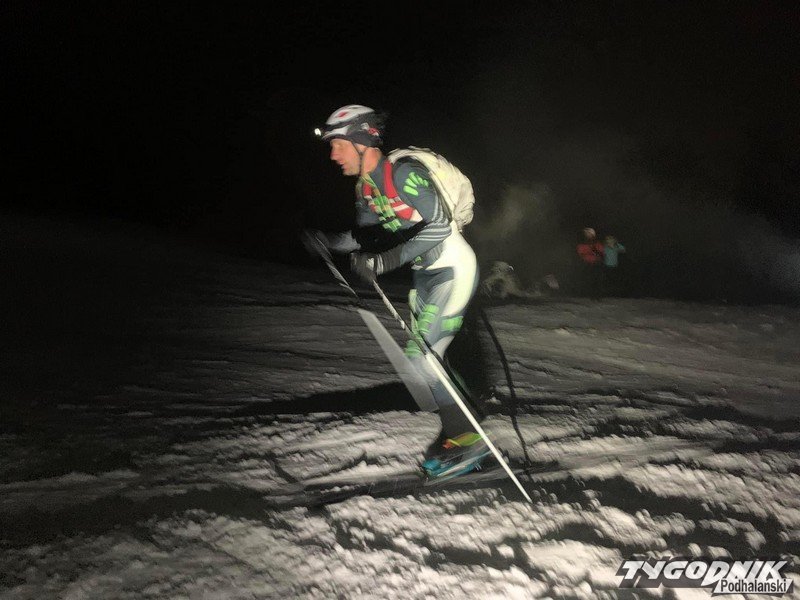 Narciarze biegli w ciemnościach, które rozświetlały zamontowane na kaskach czołówki.