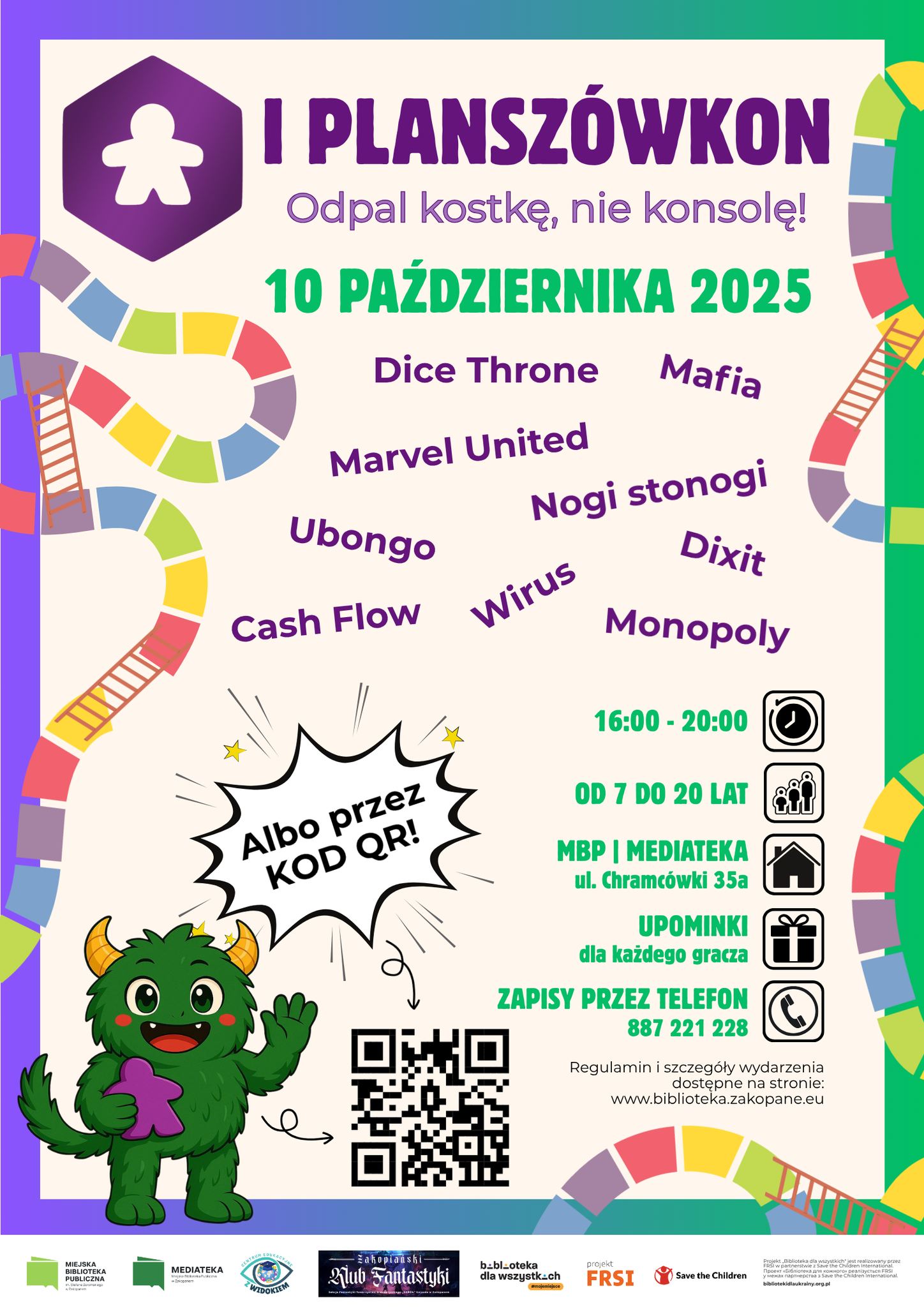 10.10, 16.00-20.00 I PLANSZóWKON. ODPAL KOSTKĘ, NIE KONSOLĘ! Program: WIEK: 7-9 lat. Rozgrywki: 16.00-17.00 Nogi Stonogi | Grzybobranie, 17.30-18.30 Pędzące Żółwie | Ubongo, 19.00-20.00 Monopoly Junior | Wirus. Warsztaty: 16.00-17.00, 17.30-18.30 I 19.00-20.00 „Planszówkowa Akademia” z grami edukacyjnymi (prowadzenie: Centrum Edukacyjne „Z Widokiem”). WIEK: 10-12 lat. Rozgrywki: 16.30-18.00 Monopoly | Dixit, 18.30-20.00 Catan | Dixit. Warsztaty: 16.00-17.30 „Fabryka Gier Planszowych” – warsztaty z tworzenia gry. WIEK: 13-15 lat. Rozgrywki: 16.00-20.00 Podróże przez Śródziemie - gra kooperacyjna wspomagana aplikacją (prowadzenie: Zakopiański Klub Fantastyki), 16.00-17.00 Dice Throne | Marvel United, 17.30-18.30 Dice Throne | Marvel United, 19.00-20.00 Dice Throne | Pory Roku. Warsztaty: 16.00-20.00 „Zbroja musi błyszczeć!” – warsztaty z malowania figurek do gry RPG (prowadzenie: Zakopiański Klub Fantastyki). WIEK: 16-20 lat. Rozgrywki: 16.00-20.00 Podróże przez Śródziemie – gra kooperacyjna wspomagana aplikacją (prowadzenie: Zakopiański Klub Fantastyki), 16.00-17.00 Dice Throne | Marvel United, 17.30-18.30 Dice Throne | Marvel United, 18.30-20.00 Mafia, 19.00-20.00 Dice Throne | Pory Roku. Warsztaty: 16.00-20.00 „Zbroja musi błyszczeć!” – warsztaty z malowania figurek do gry RPG (prowadzenie: Zakopiański Klub Fantastyki), 16.30-20.00 „Pierwsze kroki w biznesie” – warsztaty z „Cash Flow”. ZAPISY: 887 221 228, formularz zapisów: https://tiny.pl/sddrk8g4