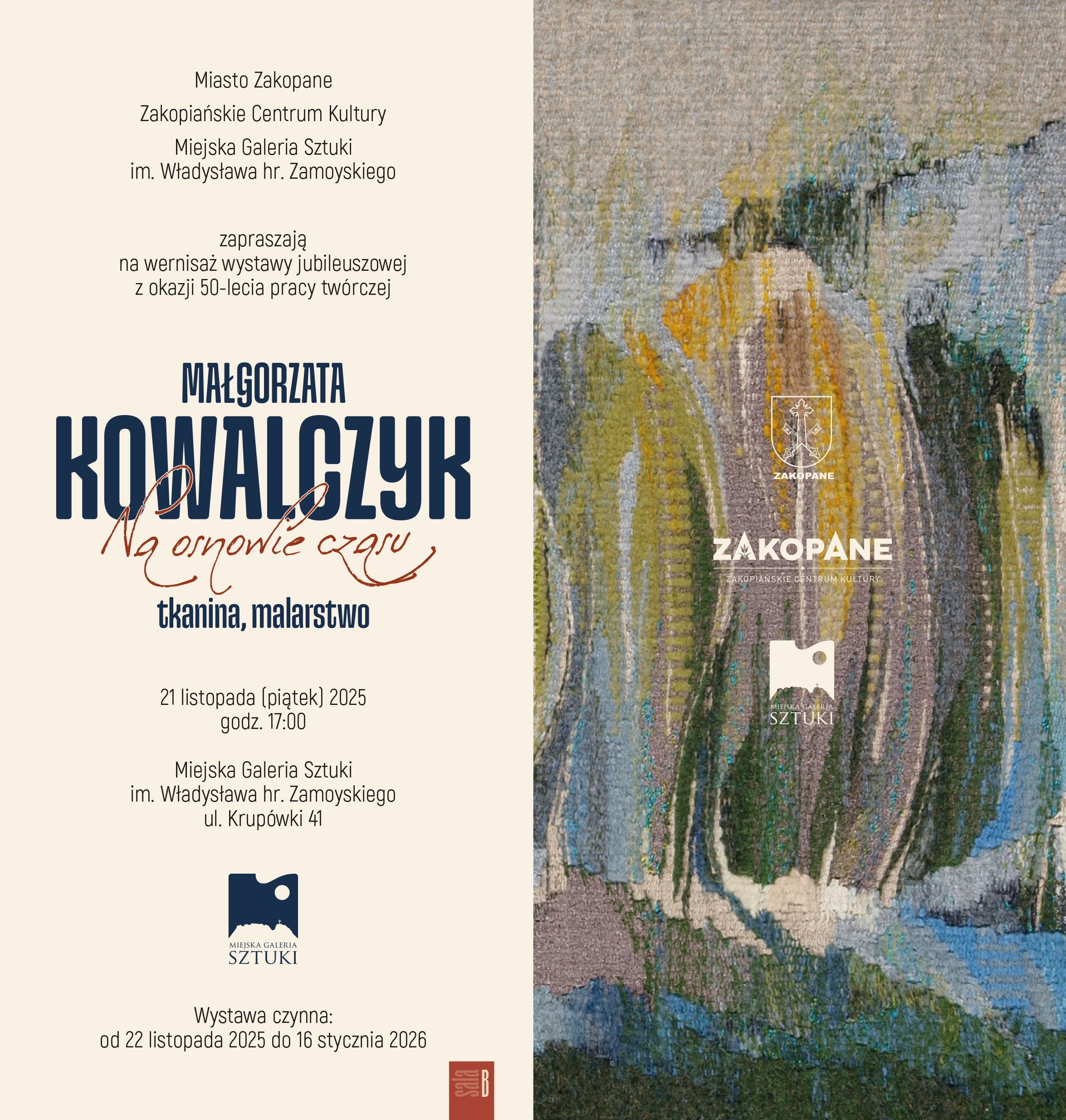 Miejska Galeria Sztuki w Zakopanem serdecznie zaprasza w piątek 21listopada 2025 r. o godzinie 17.00 na wernisaż dwóch wystaw: malarstwaAnastazji Burko-Dziemidziuk „Dom Pamięci” i Adama Molendy „Stany przejściowe” –laureatów 3. Ogólnopolskiego Konkursu Malarskiego „Moje Zakopane” oraz wystawytkaniny i malarstwa zakopiańskiej artystki Małgorzaty Kowalczyk „Na osnowieczasu”.