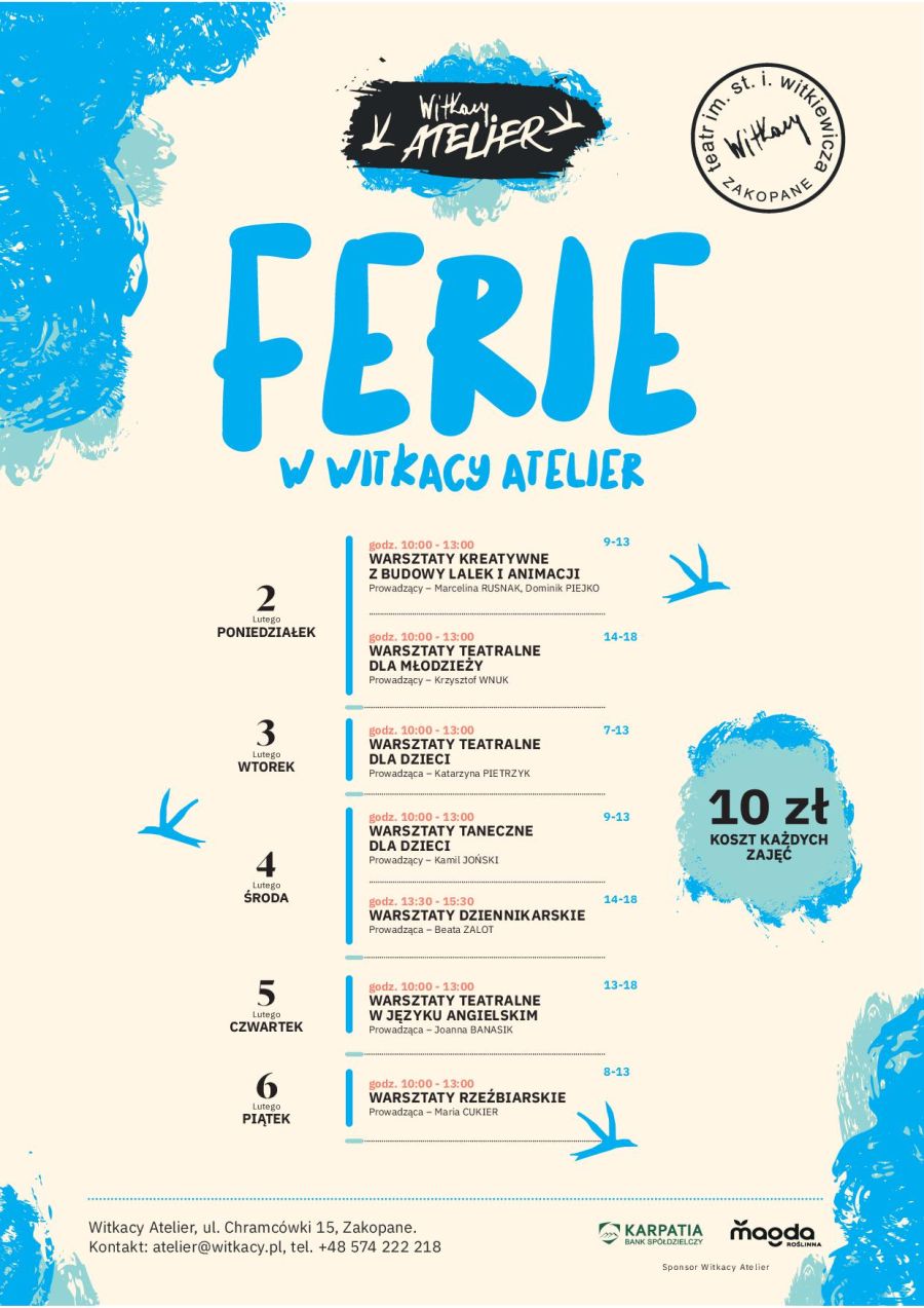 • 10:00-13:00 Warsztaty teatralne dla młodzieży, Wiek uczestnika: 14-18, Prowadzący: Krzysztof Wnuk, Witkacy Atelier, ul. Chramcówki 15, Koszt 10 zł